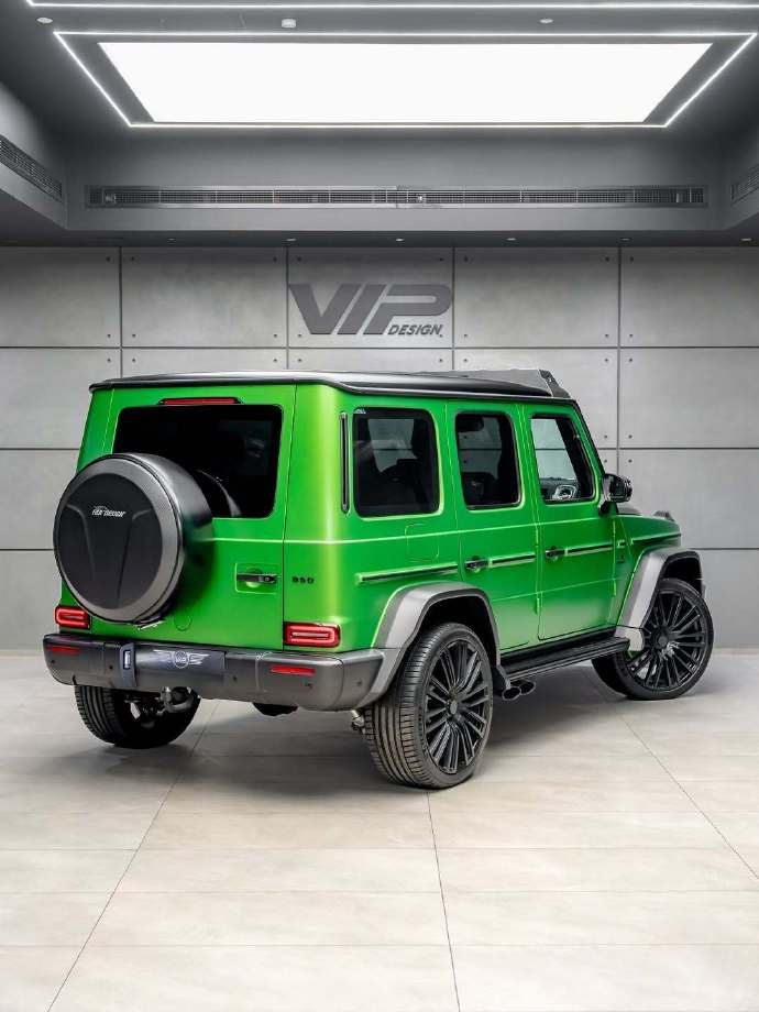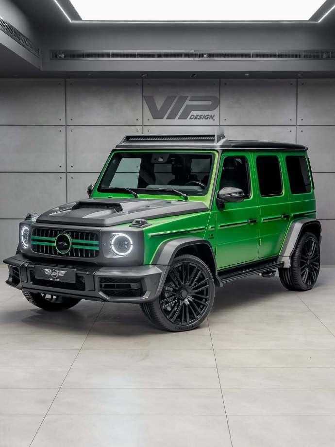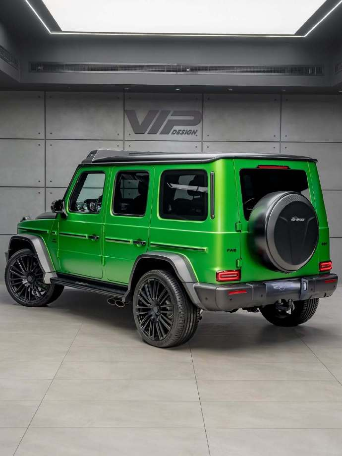 全车覆盖碳纤维套件,从机盖、后视镜外壳到轮眉、后备胎罩,23英寸大轮毂搭配荧光绿涂装卡钳,再加上碳纤维材质的车顶LED灯组,硬派轮廓里藏着满满的性能感,“这才是大G该有的嚣张模样”!