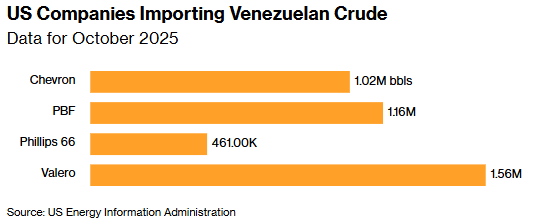 委内瑞拉国家石油公司的一家子公司曾参与多个合资项目,其中包括与Phillips66在得克萨斯州斯威尼的炼油厂合作,直接向工厂供应原油,同时以Citgo品牌运营自家设施。目前,这些进口中的一小部分仍流向美国,雪佛龙、PBF、Phillips66和瓦莱罗近期均有采购。