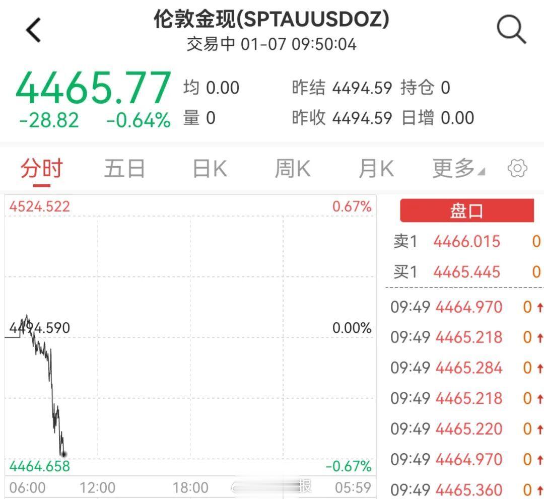 北京时间1月7日亚市早盘,受地缘政治紧张局势升级提振避险需求影响,现货黄金持续走高,逼近4500美元/盎司关口,随后直线下挫。截至发稿,现货黄金跌破4470美元/盎司,报4465.77美元/盎司,日内跌0.64%;COMEX黄金报4476.9美元/盎司,日内跌0.44%。