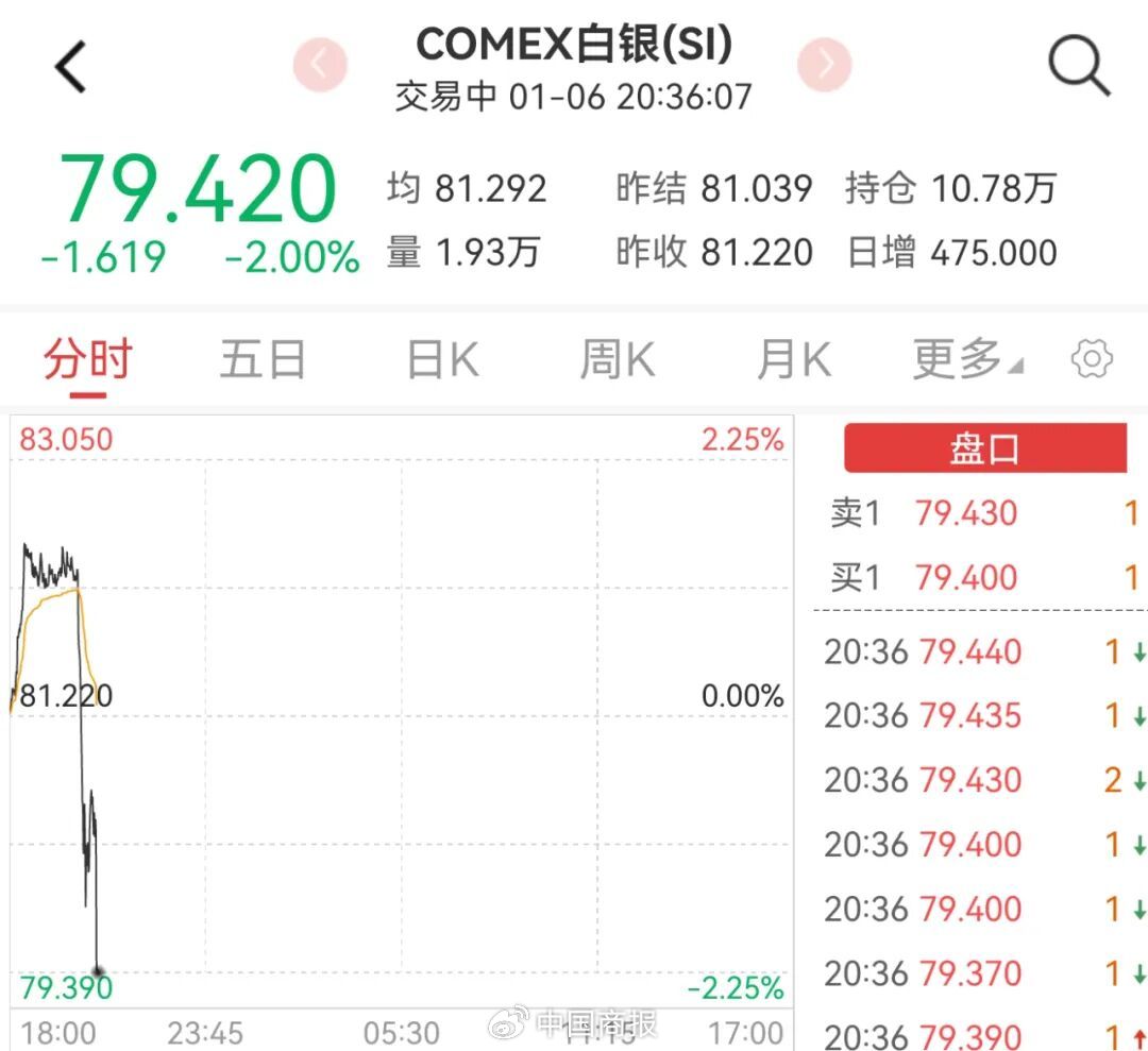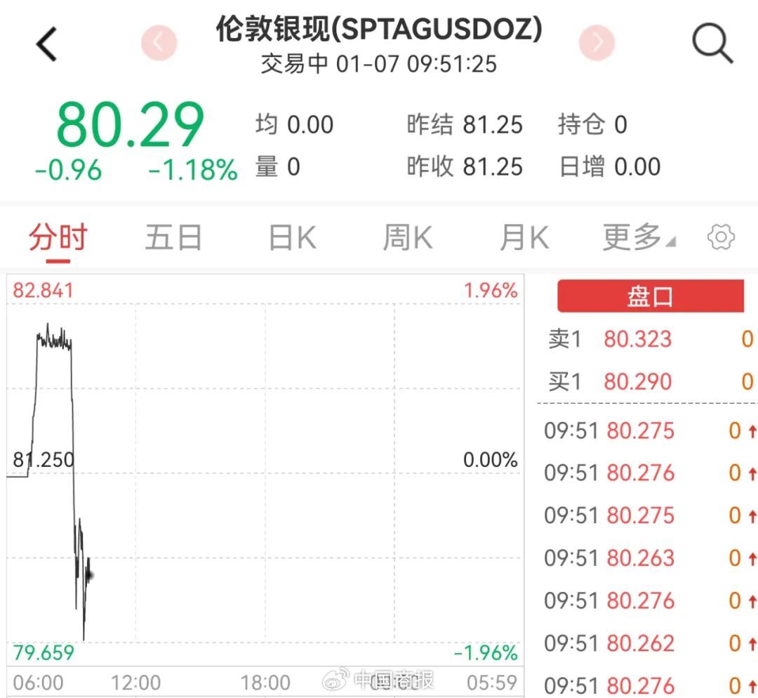现货白银盘中一度大跌超3%,现报80.29美元/盎司,日内跌1.18%。纽约期银日内跌幅达2%,现报79.420美元/盎司。
