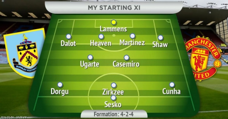 《曼彻斯特晚报》预测曼联对阵伯恩利的预计首发阵容:拉门斯;达洛特、海文、利桑德罗·马丁内斯、卢克·肖;乌加特、卡塞米罗;多尔古、齐尔克泽、库尼亚;舍什科。