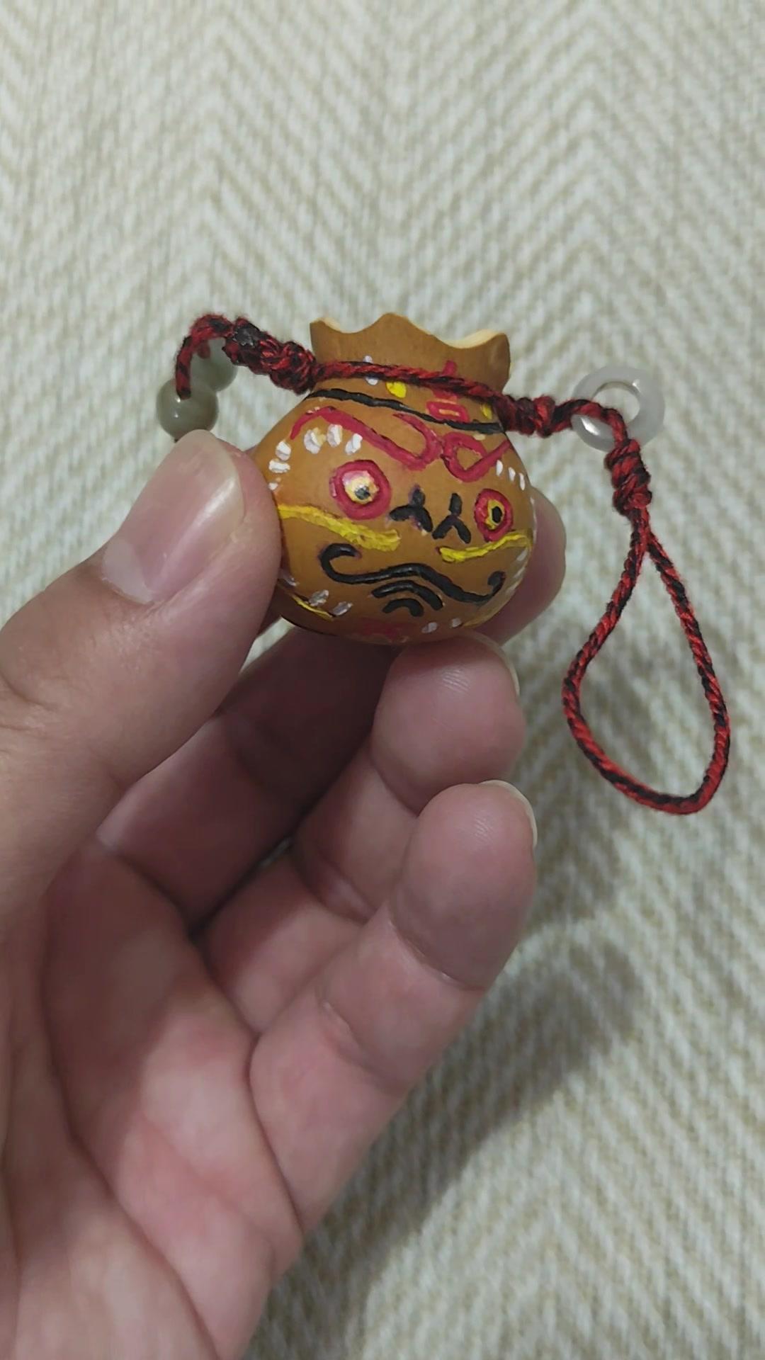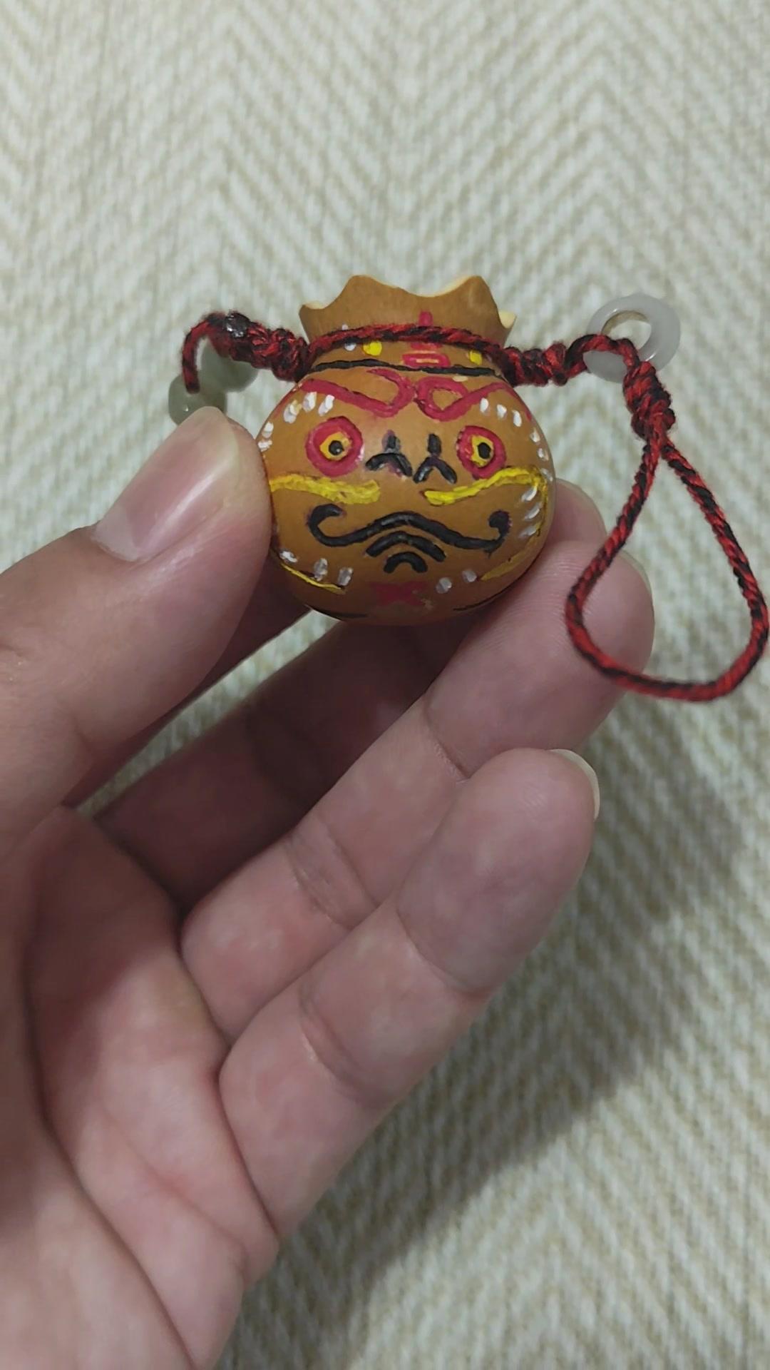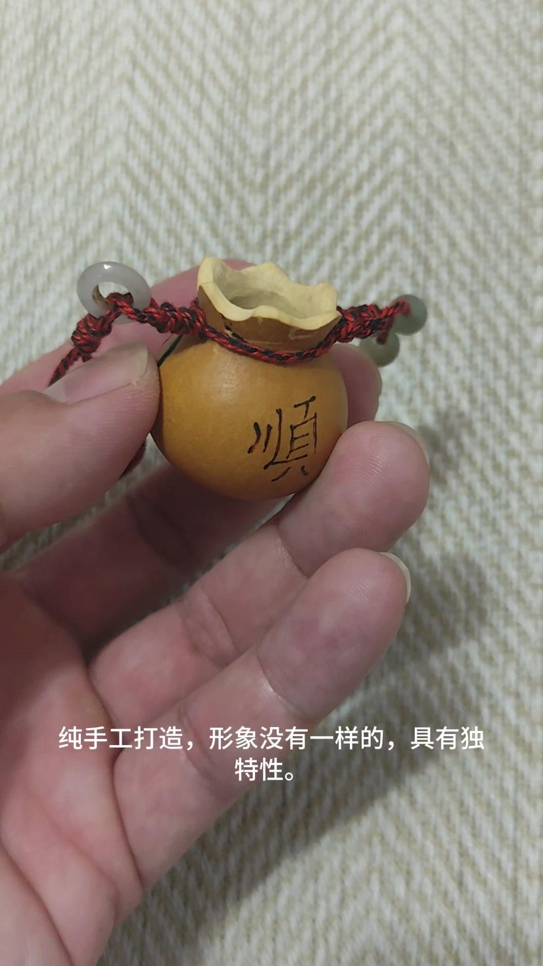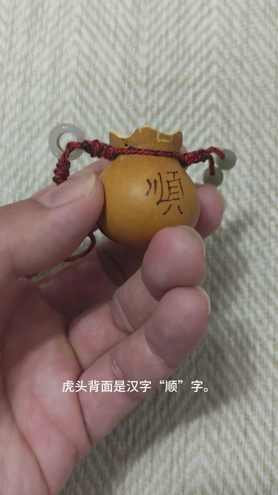 葫芦选的是钱袋品种,形状特别讨喜,肚子鼓鼓的像个小元宝。最戳我的是上面的手工雕刻,彩色虎头形象栩栩如生,每一笔都透着用心。背面还刻了“顺”字,寓意特别好,挂家里能让人安心。 配珠用的是翡翠,绿色的珠子衬着葫芦的颜色,整体看着很和谐。最难得的是纯手工打造,所以每个虎头的样子都不一样,摆在家里绝对不会撞款,独特感拉满~