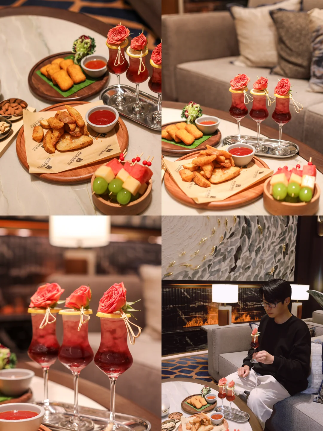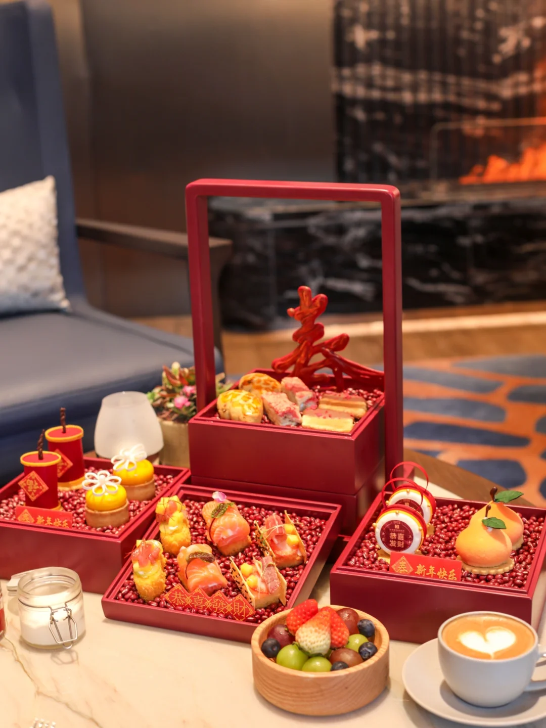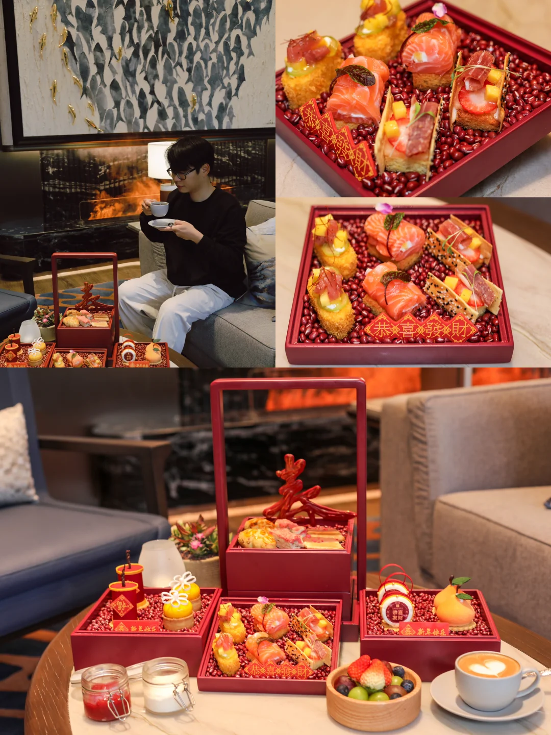下午茶用了新春主题,点心中加入了三文鱼、新鲜水果等材料,