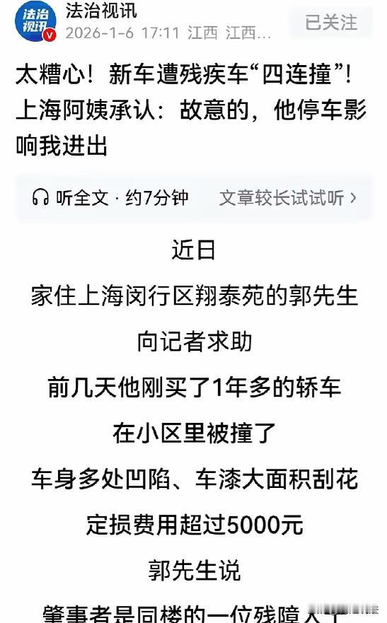 上海,郭先生在家休息时收到爱车的报警,下楼发现刚买一年多的新车右侧被撞得面目全非,查看监控发现是同楼残疾阿姨开残障车连续4次故意撞的,事后阿姨还态度强硬。经鉴定车辆损失超5000元,郭先生不原谅不和解,此前郭先生因停车问题与阿姨多次争执,阿姨私占公共车位还拒不认错。 据2026年1月6日法治视讯报道,郭先生,前阵子搬到新小区租了套房。和他同住一栋楼的,有位残疾阿姨。 这小区里设有公共车位,可数量有限。郭先生有时下班回家晚,公共车位大多被占满了,他就把车停在通道的公共车位上。 这通道公共车位车头前方,有个被阿姨私占的“专属车位”。说是专属,其实就是她自己拿东西圈起来,不让别人停车。 有天晚上,郭先生又回来得晚,照旧把车停在通道公共车位,车头超出去50厘米,其实根本不妨碍进出。 第二天一大早,郭先生还在睡梦中,突然接到保安电话,让他下楼看看车。郭先生赶紧穿好衣服下了楼。 到楼下一看,自己刚买一年多的新车,右侧被撞得面目全非,车漆刮花,车身凹陷,惨不忍睹。 郭先生赶紧跑去查看小区监控,监控里清清楚楚显示,是同楼那位残疾阿姨,开着她的残障车,连续4次故意撞向自己的车。 原来,这阿姨一直对郭先生停车的位置不满。她觉得郭先生停车离她私占的车位太近,影响了她。 郭先生想起之前,就因为停车这事,和这阿姨闹过好几次不愉快。 有一次,他刚把车停好,阿姨就气势汹汹地找过来,还喊来保安,非让他把车挪走。 郭先生跟她解释,自己停的是公共车位,而且位置也不影响别人,可阿姨根本不听,还耍起赖来,说这车位就是她的,别人不能停。 两人争执了半天,最后郭先生没办法,只好把车挪走了。从那以后,类似的争执又发生过几次,每次都是阿姨不依不饶。 这次,阿姨居然做出这么过分的事。郭先生找到阿姨理论,没想到阿姨态度强硬得很,一开始还狡辩说自己没撞,是车自己不小心刮到的。 郭先生拿出监控视频,阿姨这才没了话说,但还是嘴硬,不肯认错。社区工作人员得知此事后,赶紧过来调解。 在社区工作人员的劝说下,阿姨终于承认了自己的错误,还假惺惺地提出和解。可郭先生看着自己受损的爱车,心里那股气哪能轻易消下去。 这车刚买一年多,外观还新着,现在被撞成这样,维修费用肯定不低。经鉴定,车辆损失超过了5000元。 郭先生坚决不原谅阿姨,也不接受和解,他觉得,阿姨必须为自己的行为付出代价。 阿姨看郭先生态度坚决,又开始慌了,一会说自己身体不好,一会说自己家庭困难,希望郭先生能高抬贵手。 但郭先生不为所动,他觉得,残疾不是犯错的借口,做错了事就得承担责任。 那么,以法律的角度该如何分析这事呢? 1、阿姨故意撞车,法律上如何定性呢? 阿姨故意开车连撞郭先生新车4次,从法律角度看,这属于故意毁坏公私财物的行为。 根据《刑法》第二百七十五条,故意毁坏公私财物,数额较大或者有其他严重情节的,要处三年以下有期徒刑、拘役或者罚金;数额巨大或者有其他特别严重情节的,处三年以上七年以下有期徒刑。 这里说的“数额较大”,一般是指损失在5000元以上。 郭先生的车刚买一年多,外观还新,经鉴定损失超5000元,完全符合“数额较大”的标准。 所以,阿姨的行为要是被认定,可就不是简单的道歉赔偿就能了事的了。 您觉得阿姨这种行为是不是太过分了?您在生活中遇到过类似故意破坏他人财物的事吗? 2,阿姨是残疾人,能不能减轻处罚? 阿姨拿自己残疾,当挡箭牌,说自己不是故意的,想以此减轻处罚,但法律可不是这么规定的。 根据《刑法》及相关司法解释,犯罪行为是否构成犯罪、是否应受处罚,主要看行为本身是否符合犯罪构成要件,而不是看行为人是不是残疾人。残疾人犯罪,同样要为自己的行为负责,不能因为身体有残疾就逃避法律的制裁。 当然,如果阿姨在犯罪过程中确实因为身体原因,行动不便等,导致犯罪情节相对较轻,法院在量刑时可能会酌情考虑,但这绝不是免责的理由。 3,郭先生不原谅不和解的处理方式,法律上能得到支持吗? 郭先生因为这事气得不轻,坚决不原谅不和解,从法律角度看,这是郭先生的权利。 根据《刑事诉讼法》及相关司法解释,在刑事案件中,被害人有权决定是否与犯罪嫌疑人、被告人达成和解。如果被害人不愿意和解,司法机关不会强制要求。 而且,即使双方达成和解,司法机关在量刑时也会综合考虑犯罪情节、犯罪后果、犯罪嫌疑人的认罪态度等因素,不会因为和解就轻易减轻处罚。 所以,郭先生不原谅不和解,完全合法合理。 目前,此案还在处理中,等待最终结果。 但不管结果如何,阿姨都得为自己的行为负责,法律不会因为她是残疾人就网开一面,也不会因为郭先生不原谅就加重处罚。 您觉得郭先生不接受和解的做法对吗?您对这件事有什么看法呢?