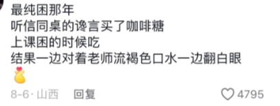 最纯困那年,听信同桌的谗言买了咖啡糖,上课困的时候吃,结果一边对着老师流褐色口水,一边翻白眼