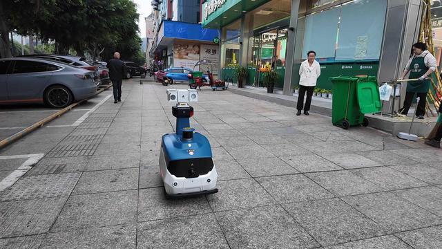 “请勿乱扔果皮、垃圾,麻烦尽快清理干净。”当识别到一家水果店存在乱扔果皮的现象后,机器人自动发起了语音提醒。随后,店员上前清扫了果皮。