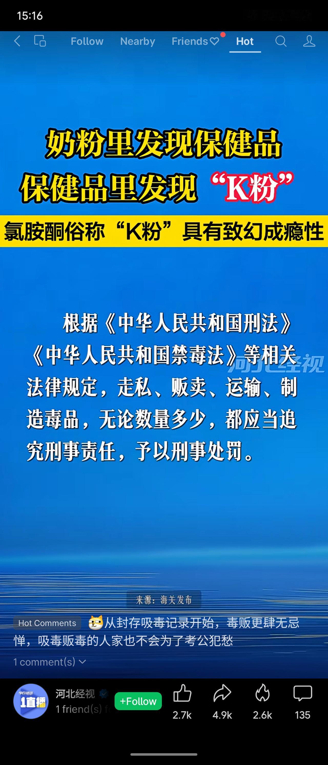温州海关在查验一票申报为“奶粉”的包裹时,发现其中两瓶保健品内藏匿有共计494克氯胺酮(俗称“K粉”),检测呈阳性。案件已移交缉私部门处理。