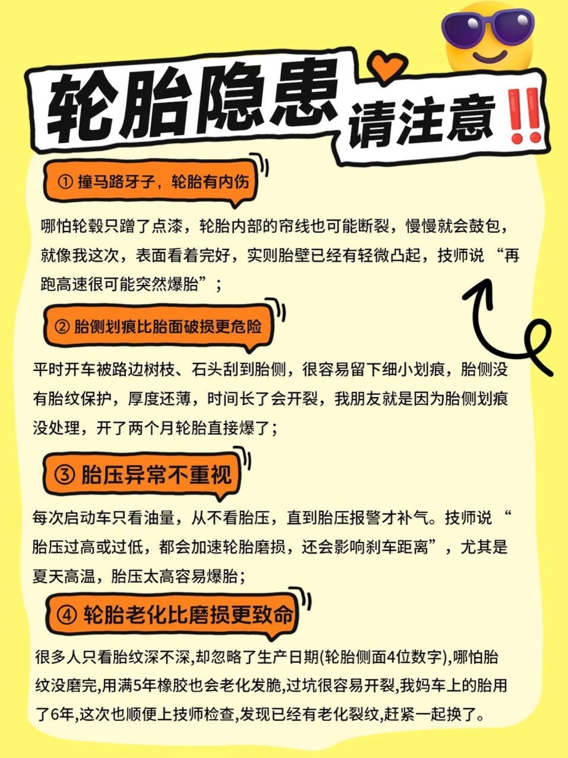 那次蹭到马路牙子我没在意,直到洗车时师傅指着轮胎说:“这儿鼓包了,再跑高速很危险。”惊出我一身冷汗。原来许多看似不起眼的“小伤”,正悄悄埋下隐患:⚠️ 胎侧鼓包撞马路牙子后,即便轮毂只掉点漆,内部帘线也可能断裂,导致鼓包,高速行驶易爆胎。🚨 胎侧划痕胎侧没有胎纹保护,被刮后易开裂,比胎面破损更危险。🔧 忽视胎压胎压过高或过低都会加剧磨损、影响刹车。夏天胎压过高,爆胎风险更大。📅 不看生产日期轮胎侧面4位数字代表生产日期(如2524即24年第25周)。超过5年橡胶会老化,即使胎纹深也存隐患。轮胎是安全底线,别等出事才检查我与汽车的日常大v聊车