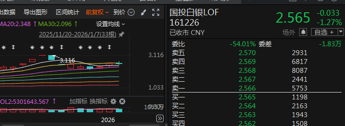 上证报中国证券网讯(记者朱妍)截至1月7日15点15分,COMEX白银期货价格下跌2.71%。跟随银价的走势,1月7日,在停牌1小时后,国投白银LOF高开低走。在开年连涨2日后,该基金出现回调,当日场内价格报收2.565元,下跌1.27%,场内溢价率达到20.32%。