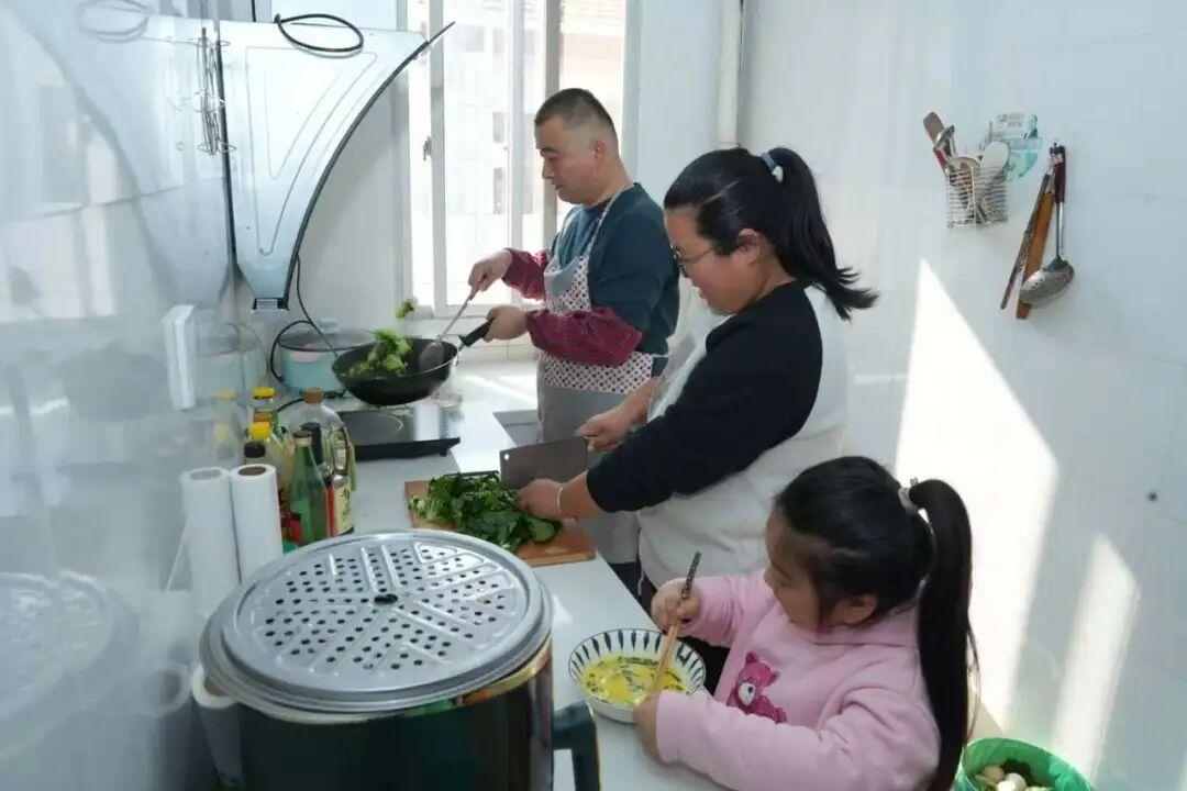 环卫工田中杰一家在崭新的厨房里做饭。王啸天摄