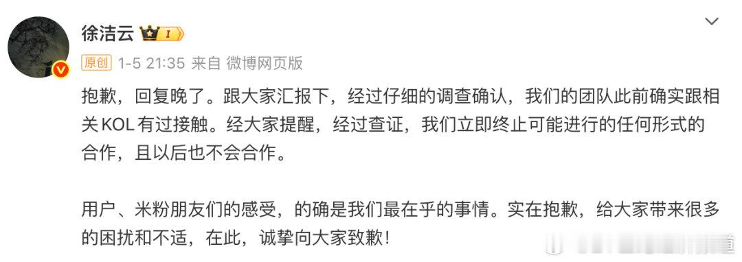 1月6日深夜,小米公司发言人官方微博发文,对“团队与相关KOL接触一事”公开道歉,并作出严肃处理:辞退涉事经办员工,集团副总裁兼CMO许斐和公关部总经理徐洁云被通报批评并取消年度奖金。