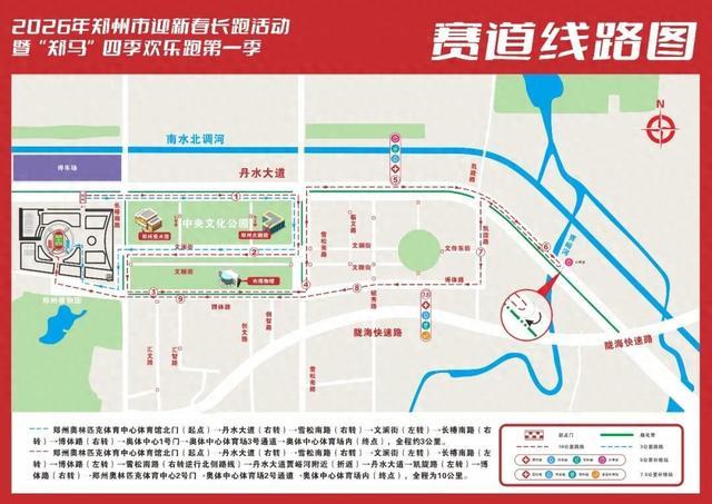 起点设在丹水大道(郑州奥林匹克体育中心北门外),长跑队伍沿丹水大道南半幅道路(向东)—雪松南路西半幅道路(向南)—文澜街(向西)—长椿南路西半幅道路(向南)—博体路(向西)—奥体中心1号门内部路(向西)—终点(奥体中心体育场3号门)