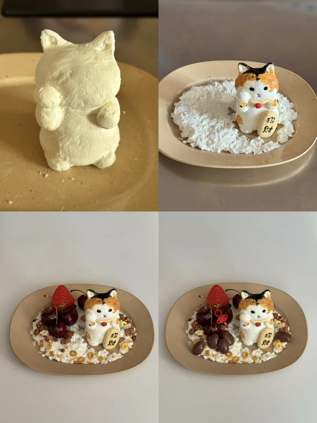 2️⃣ 先用一部分酸奶打底,剩余的酸奶用保鲜膜先大概捏出形状再调整细节,最后黑芝麻酱和花生酱画上纹路和表情