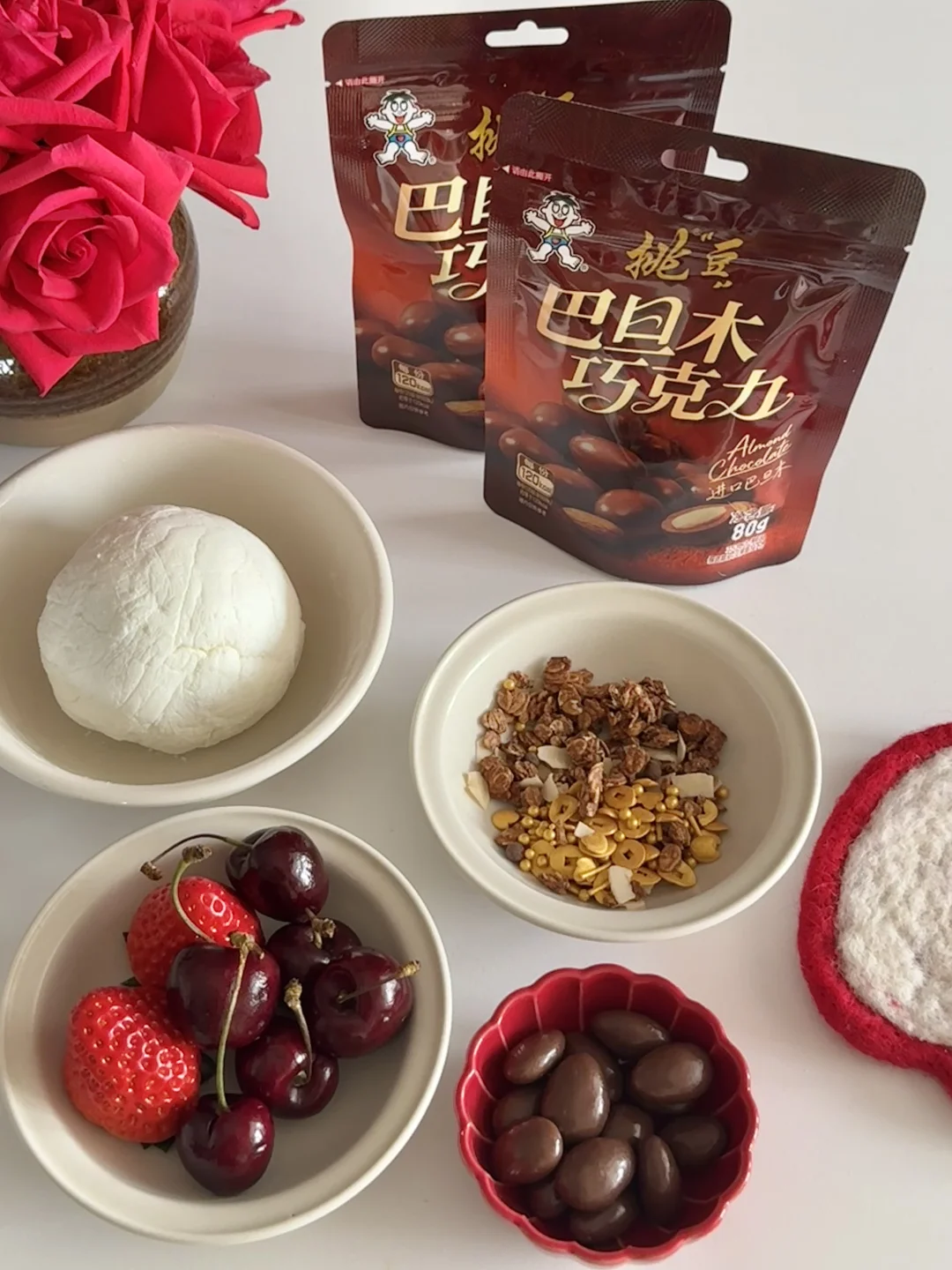 3️⃣放上旺旺挑豆巴旦木巧克力、燕麦和的水果就好啦!