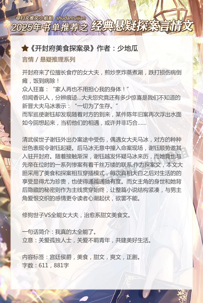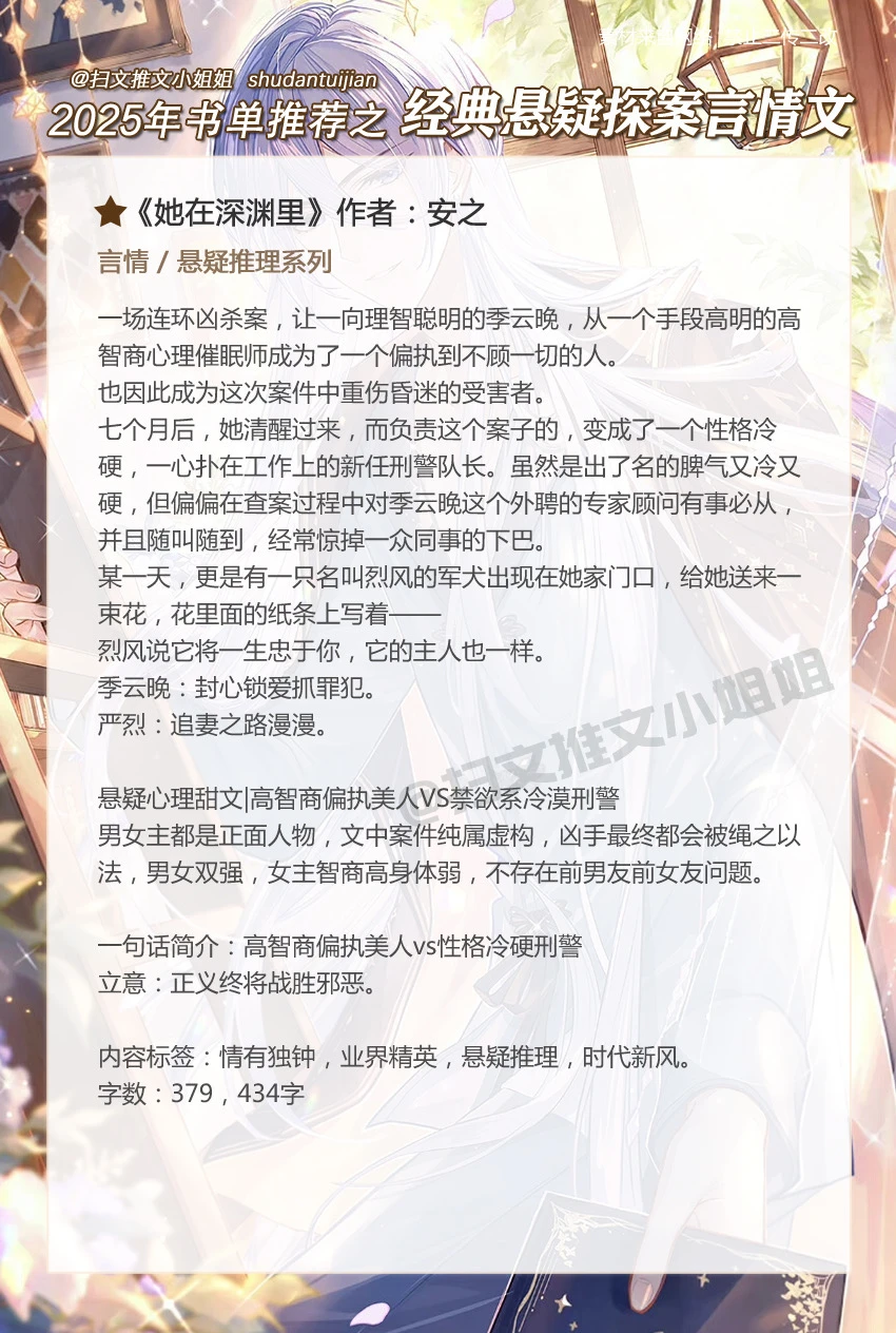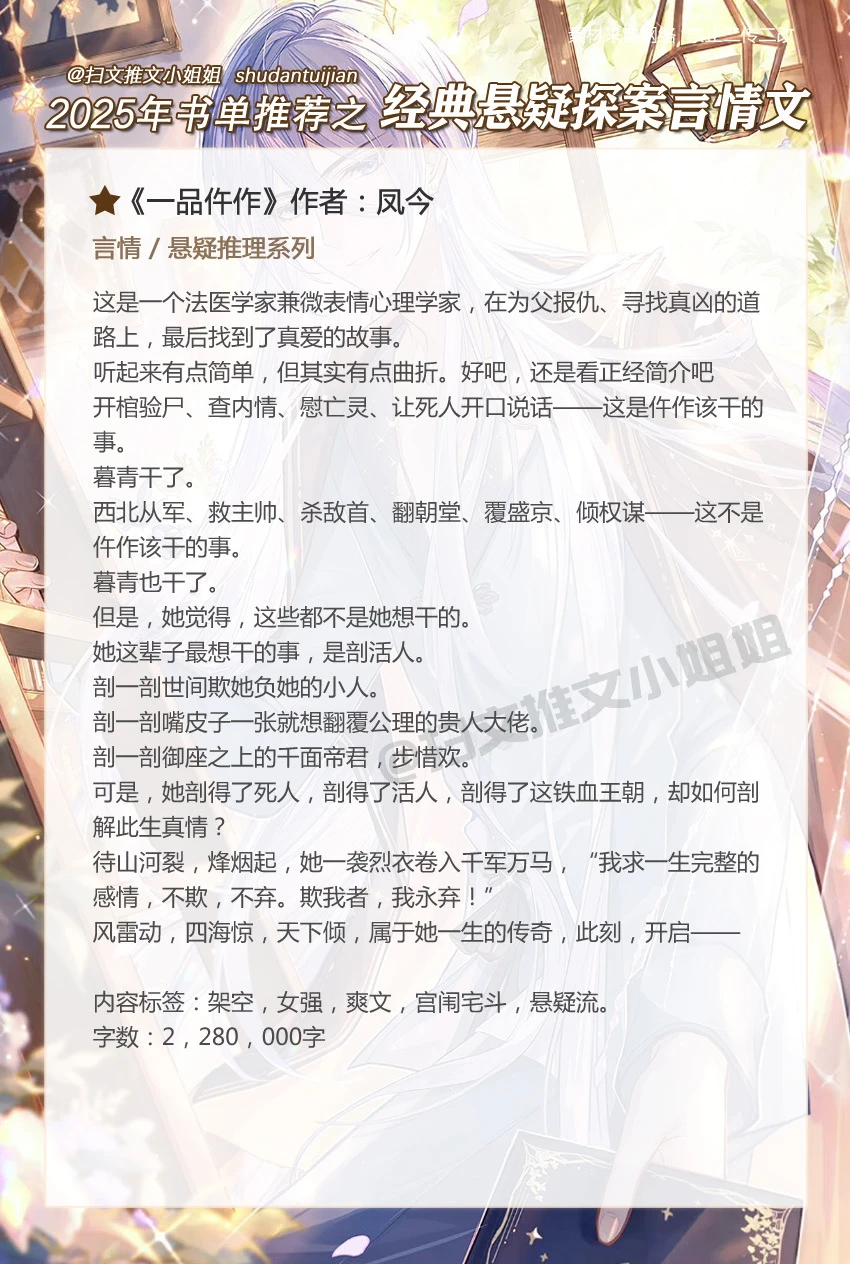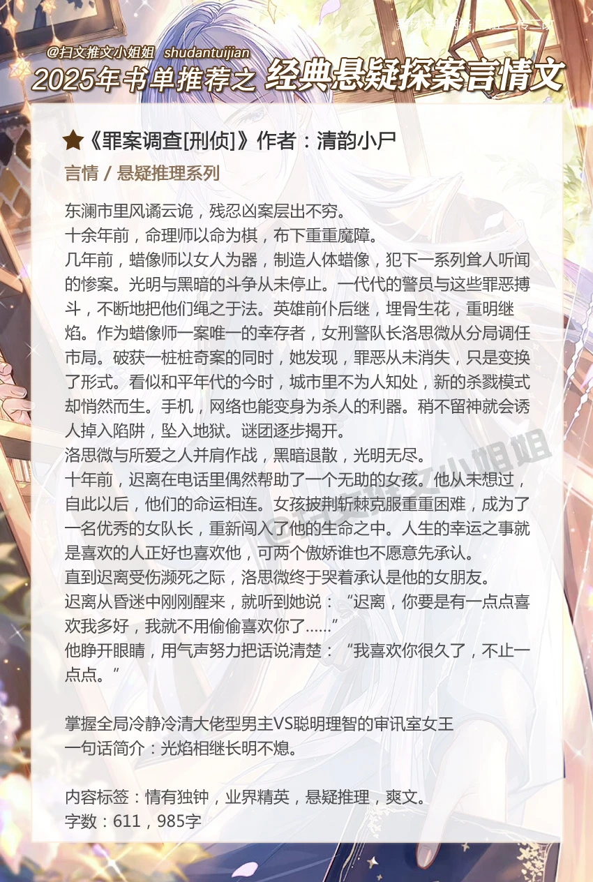 男强女强携手探案,全程烧脑高能,超精彩的你一定也会喜欢![哇R][哇R] 1、《花重锦官城》作者:凝陇 2、《司南》作者:侧侧轻寒 3、《一品仵作》作者:凤今 4、《罪案调查[刑侦]》作者:清韵小尸 5、《悬崖下》作者:喜河山 6、《她在深渊里》作者:安之 7、《名侦探夏贵妃》作者:衣带雪 8、《开封府美食探案录》作者:少地瓜 9、《晴天遇暴雨》作者:明月听风