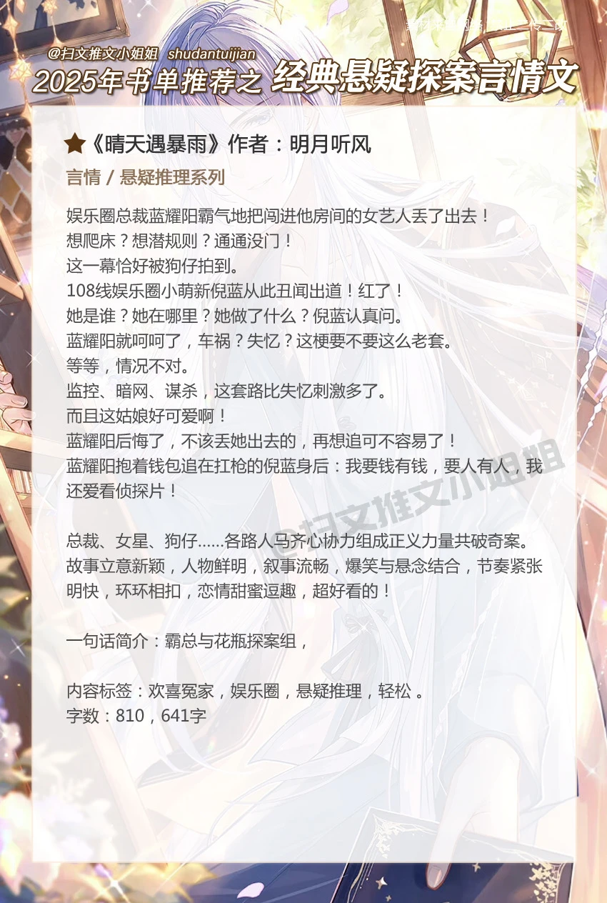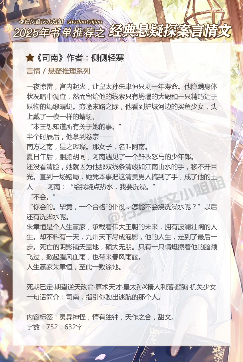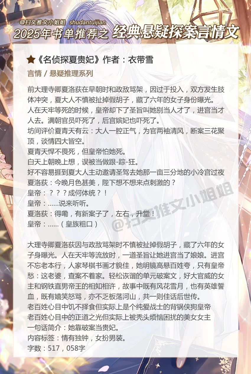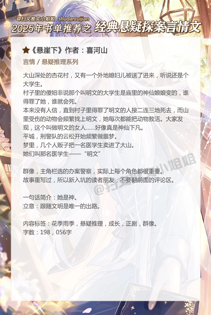 男强女强携手探案,全程烧脑高能,超精彩的你一定也会喜欢![哇R][哇R] 1、《花重锦官城》作者:凝陇 2、《司南》作者:侧侧轻寒 3、《一品仵作》作者:凤今 4、《罪案调查[刑侦]》作者:清韵小尸 5、《悬崖下》作者:喜河山 6、《她在深渊里》作者:安之 7、《名侦探夏贵妃》作者:衣带雪 8、《开封府美食探案录》作者:少地瓜 9、《晴天遇暴雨》作者:明月听风