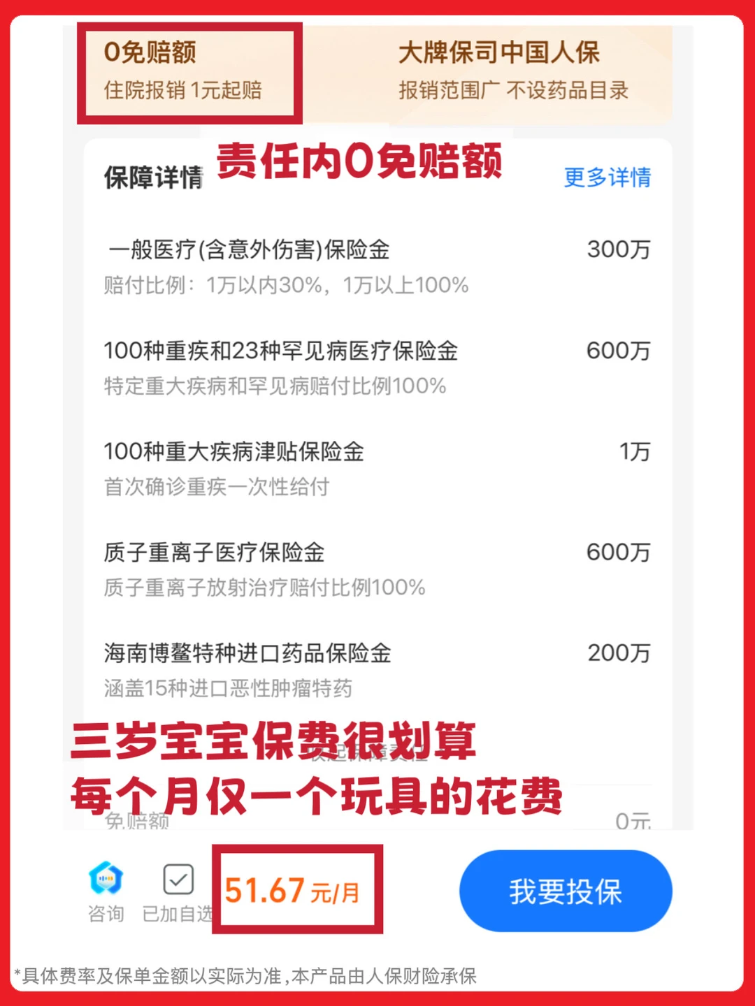 ✅ 性价比很高:对比下来,同样保障的产品里,这款价格很实在。每个月少买一件玩具🚗,可以换来百万的医疗保障,万一住院能给钱包减轻不少负担,有小孩的家庭用上真不亏。
