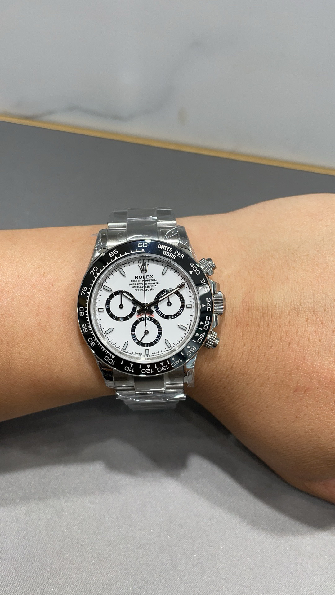 劳力士白熊猫迪通拿(型号126500LN)是腕表界的"六边形战士",集颜值与实力于一身。这款腕表最吸引人的是它的经典"熊猫盘"设计——白色表盘搭配三个黑色计时小表盘,黑白对比鲜明,辨识度极高。