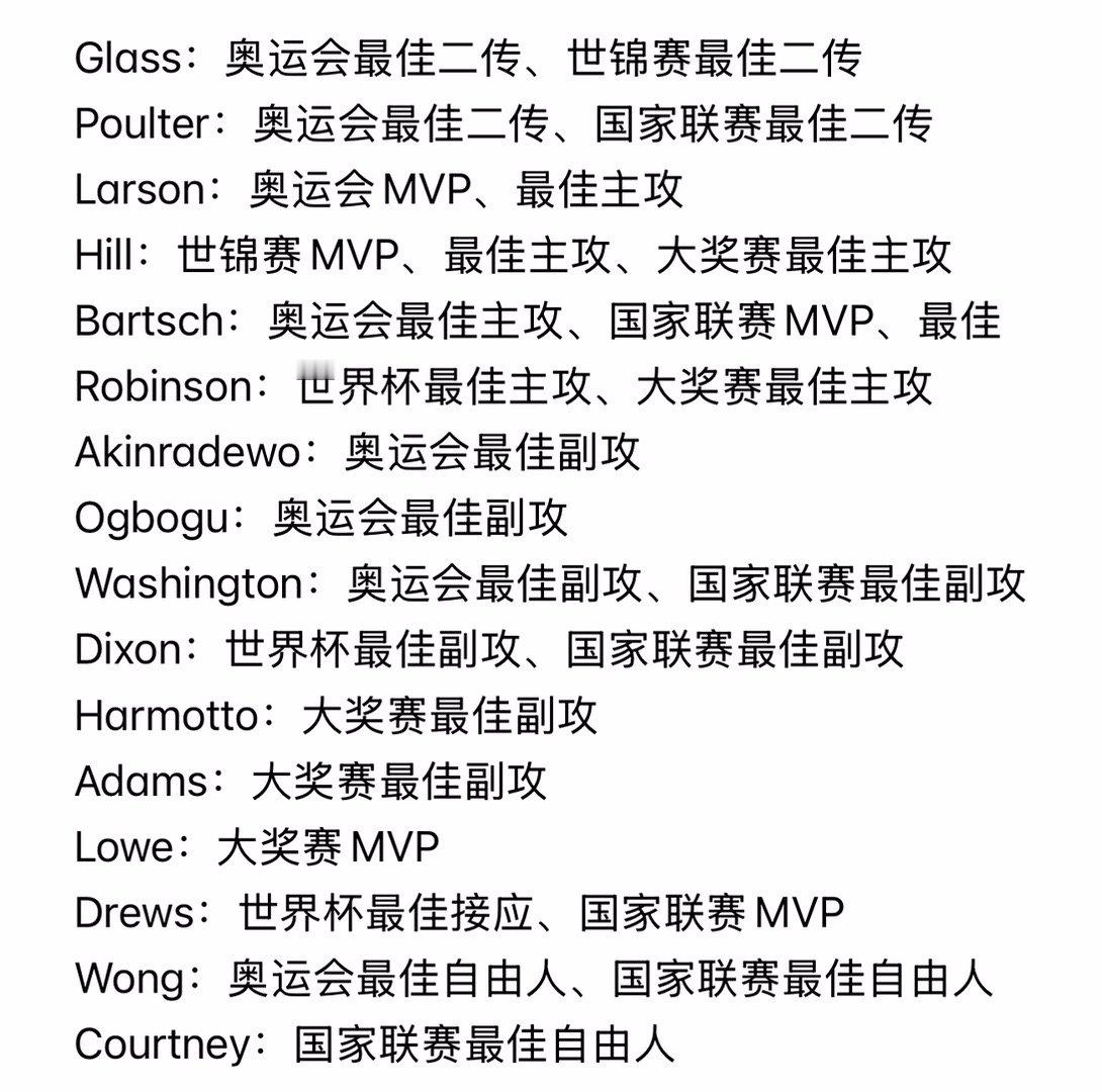 去年总结了基拉里带队美国女排10年的成绩:四强概率88%,奖牌概率75%。今年总结下十年间美国球员在国家队取得的单项奖,可以说是群星璀璨……和有些球迷刻板印象不同的是,美国球员并不是脱离了国家队的体系就不行了,去到欧洲职业赛场,她们依然能帮助球队创造辉煌,并且拿奖也毫不手软,欧冠、土超、意甲、世俱杯的MVP都被她们摘取过。当然都是主攻拿的,所以我一直觉得之前最强的主攻线在美国,不是一个人强,是每个人都强。技术全面、性价比高是她们集体打造出的金字招牌。如今,丝巾也强势崛起,越发的成熟稳定,刚刚拿到了世俱杯最佳主攻,应该会成为美国队新一代的核心。富兰克林优越的身体条件也非常有培养价值。私心希望今年国家队的比赛拉内尔有更多机会,不过美国主攻线真的好卷。