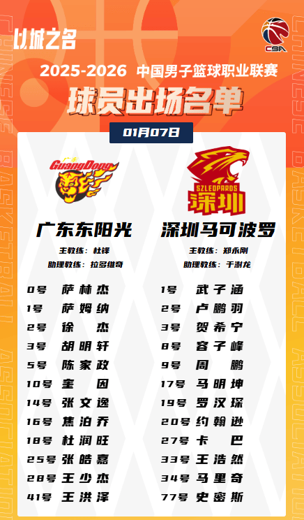 虎扑01月07日讯今晚CBA常规赛,广东对阵深圳的大名单已经公布。