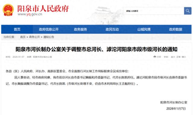 1月7日,阳泉市河长制办公室发布关于调整市总河长、滹沱河阳泉市段市级河长的通知,具体如下。