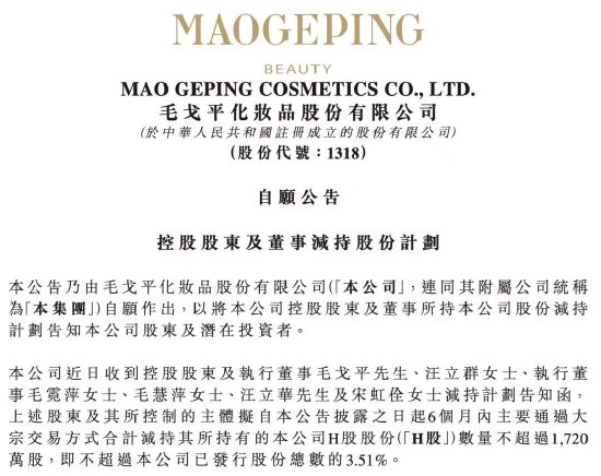 1月7日,昨日晚间,毛戈平化妆品股份有限公司(HK01318,以下简称毛戈平公司)发布减持公告。公司控股股东及执行董事毛戈平、汪立群(毛戈平配偶)、执行董事毛霓萍(毛戈平姐姐)、毛慧萍(毛戈平姐姐)、汪立华(汪立群弟弟)及宋虹佺基于自身财务需求,拟在减持预披露公告发布之日起6个月内,主要通过大宗交易方式合计减持其所持有的公司H股股份数量不超过1720万股,即不超过公司已发行股份总数的3.51%。