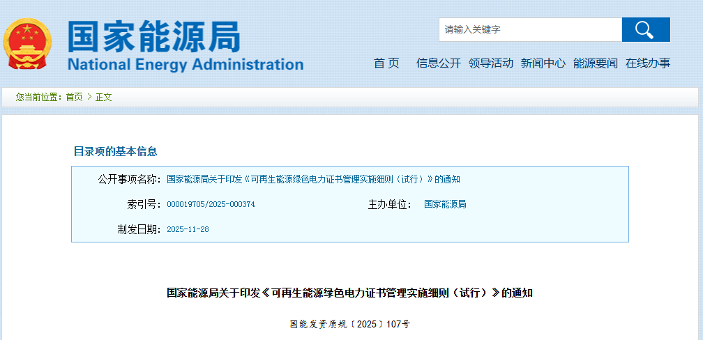 光伏头条获悉,1月7日,国家能源局发布关于印发《可再生能源绿色电力证书管理实施细则(试行)》的通知。
