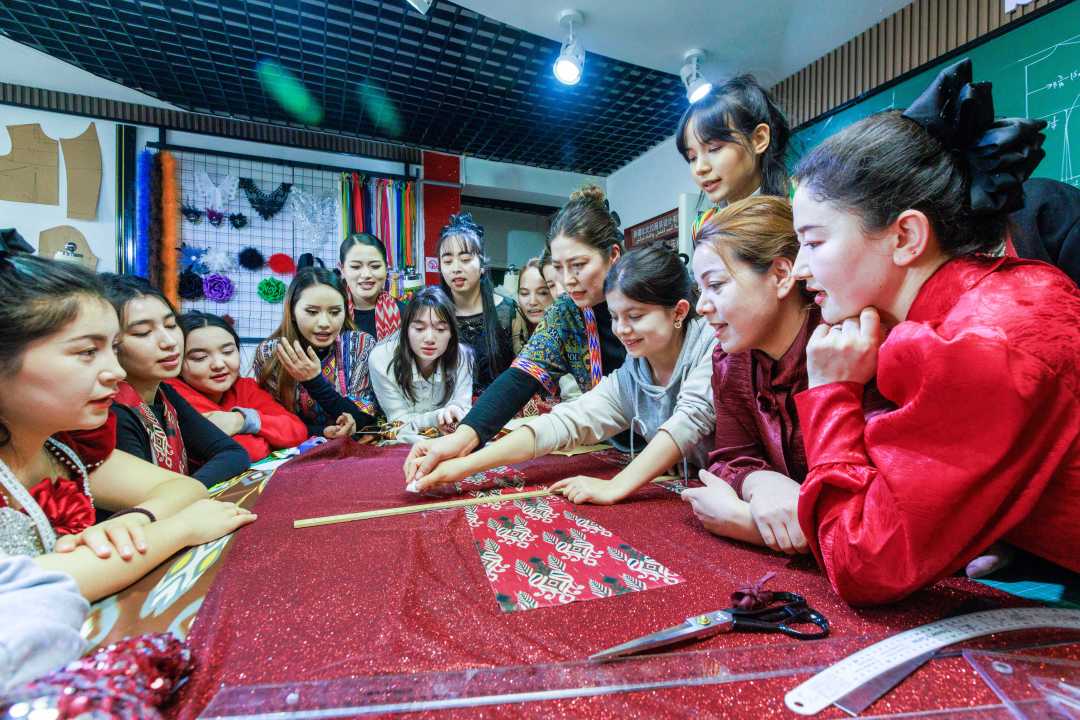 1月6日,位于新疆维吾尔自治区乌鲁木齐市沙依巴克区友好南路街道的新疆比比拉服装设计公司,学员在进行服装裁剪练习。