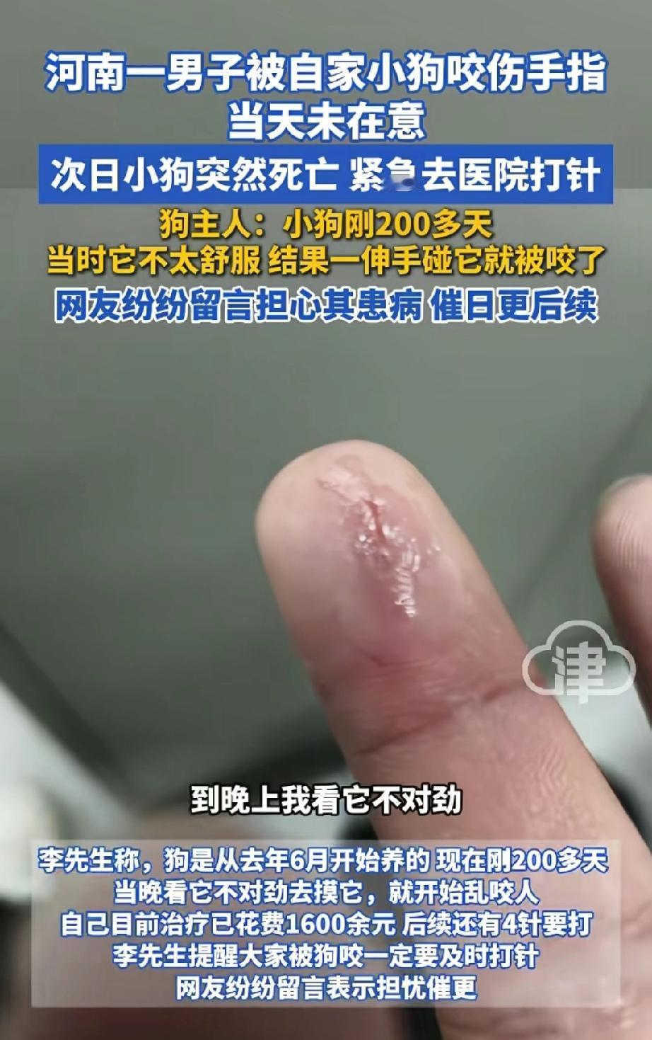 后怕!河南李先生养了条狗,晚上七点回家后,发现狗状态不佳。他上前抚摸,不料被狗狠狠咬了一口。起初,他并未在意,然而第二天下午4点,狗却突然死去。李先生顿觉情况不妙,赶忙前往医院打针。网友惊呼:狂犬病! 李先生家中养了只小狗,平日与家人相处融洽,温顺又黏人,没人把它视作“危险分子”。 那天他回家,见小狗状态异常,伸手去摸,不知为何,狗突然一口咬在他手指上。伤口不算太深,只是破了点皮、流了点血。 李先生心想,这是自家养的狗,又非野狗,肯定没事。他随手擦去血迹,连肥皂水冲洗都没做,更没想过去打狂犬疫苗。他觉得这是小题大做,不过被咬一下,过两天就会好。 谁能料到,转天下午4点,狗突然没了呼吸,不明不白地暴毙。李先生瞬间头皮发麻,一想到狂犬病的可怕,他坐不住了,立刻飞奔到医院。 医生为他紧急处理伤口,给他打了狂犬疫苗、血清和免疫球蛋白,这一趟就花了1600多元。而且,接下来他还需按时打完剩下的4针疫苗。这次疏忽,让他付出了不小的金钱和精力代价。 有网友说:“我家狗也咬过我,当时没处理,现在想想真后怕!” 别抱有“侥幸心理”!谁都觉得“倒霉事不会轮到自己”,可意外从不提前打招呼。 自家狗又怎样?就算打了疫苗,也无法百分百保证安全,何况被咬伤后连基本处理都不做,这不是拿自己生命开玩笑吗? 狂犬病死亡率几乎达100%,一旦发病根本来不及救治。别觉得“咬一下没事”,有时候就这一下,就能毁掉一个家庭。 那些说“小题大做”的人,真该醒醒了,生命面前无小事! 千万别以为“我家狗打过疫苗”“伤口小没关系”。狗牙很尖,易造成深而窄的伤口,细菌和病毒会直接注入深处,简单冲洗根本没用。 此前就有新闻,有人被鱼鳍扎了一下没在意,最后竟截指。 对待宠物咬伤,没有“万一”,只有“一万”。只要破皮出血,就必须立即就医,由专业医生判断如何处理。 正确处理步骤:立即用肥皂水和流动清水交替清洗伤口至少15分钟;尽快前往正规医院或疾控中心,根据医生建议接种狂犬疫苗和/或免疫球蛋白。 牢记“十日观察法”:这是为保护自己,而非先观察再决定。必须“先打针,再观察”,顺序绝不能错。 养宠物是一种陪伴,但安全意识是底线。别让一时疏忽,酿成无法挽回的悲剧。请把这份提醒,转给你关心的每个人!