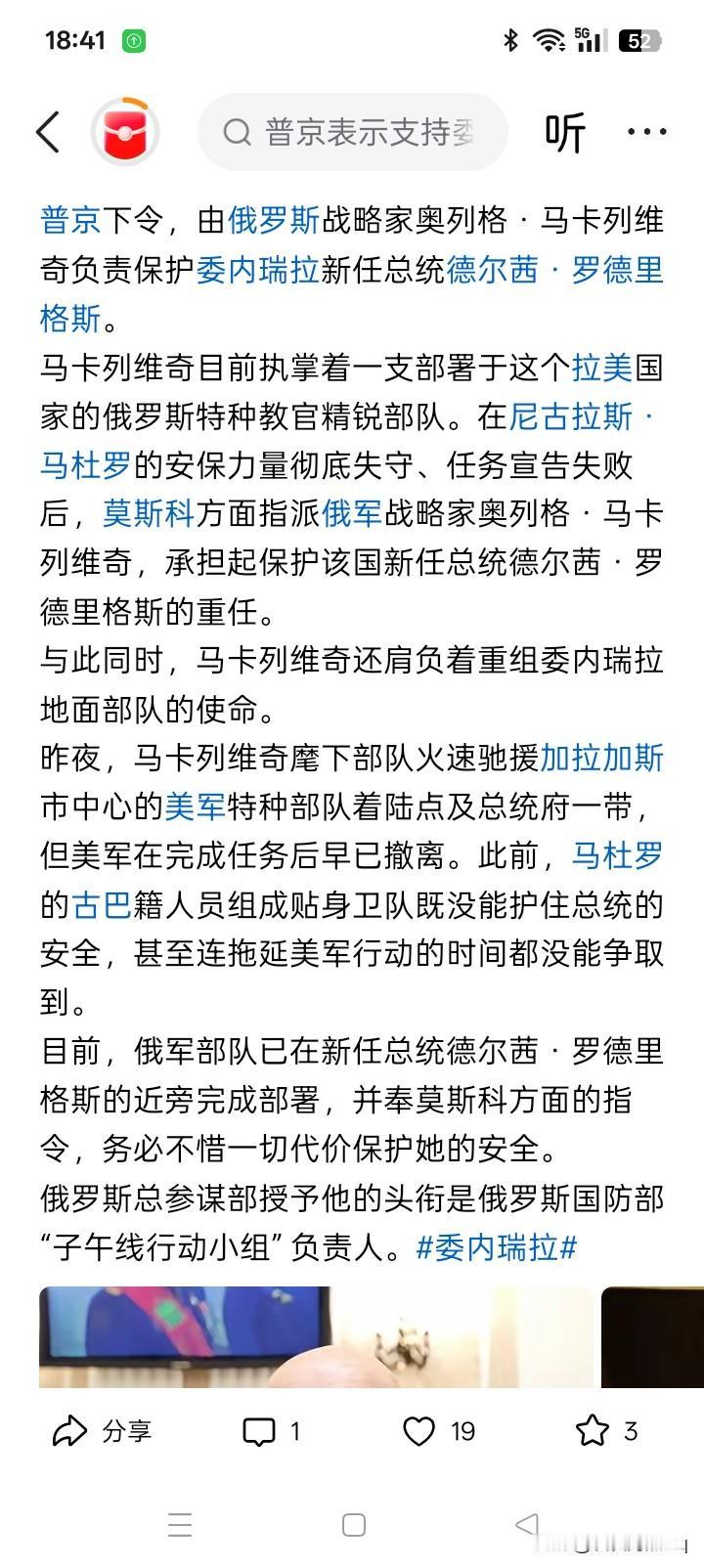 上将战略家横空出世? 在美国军队的直升机载着特种部队士兵侵入委内瑞拉的时候,据传闻说委内瑞拉当时住有一位俄罗斯的上将奥格·马卡列维奇,他带着可能是为数有限的一群俄罗斯士兵驻扎在委内瑞拉。当天美军侵入委内瑞拉事情,据传闻说马卡列维奇当时好像一无所。 马卡列维奇上将曾经在俄罗斯军队任第聂伯集团军司令,大概是带领军队在乌克兰的赫尔松地区作战不力,因而被撤销集团军司令一职,后来被派往委内瑞拉。 但是,今天在网络上看到一个令人惊心动魄的消息,普京下令,由战略家奥格·马卡列维奇将军负责保护委内瑞拉新总统(好像是代理总统)德尔茜·罗德里格斯的安全。而且,马卡列维奇还负责重组委内瑞拉地面部队的使命。这个消息真的是让人匪夷所思,马卡列维奇突然之间一下子成了战略家了。 上述消息令人疑窦丛生,别的暂且不说,但好像委内瑞拉的地面部队在美军的这次入侵行动中,并没有受到多大的损失,甚至是与地面部队的关系也不是很大,为什么要重组地面部队呢?