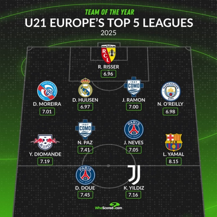 whoscored2025年五大联赛U21最佳阵: