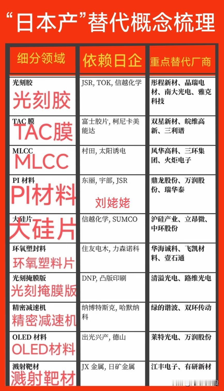 【光刻胶等“国产替代”概念梳理】近日,日本对高端光刻胶(ArF、EUV等)实施严格出口管制,实际交付基本停摆,成熟制程光刻胶维持受限供应。 商务部:对原产于日本的进口二氯二氢硅发起反倾销立案调查。 光刻胶被卡脖子事件继续发酵,国产替代重要厂商梳理。 关注“刘姥姥”,精彩分享真不少(麻烦亲们:点赞,收藏,分享)。 特别提醒:本文涉及内容及个股,仅供交流与参考,不是荐股,不得以此作为买卖依据,盈亏自负。中国光刻技术 中企光刻机 光刻技术