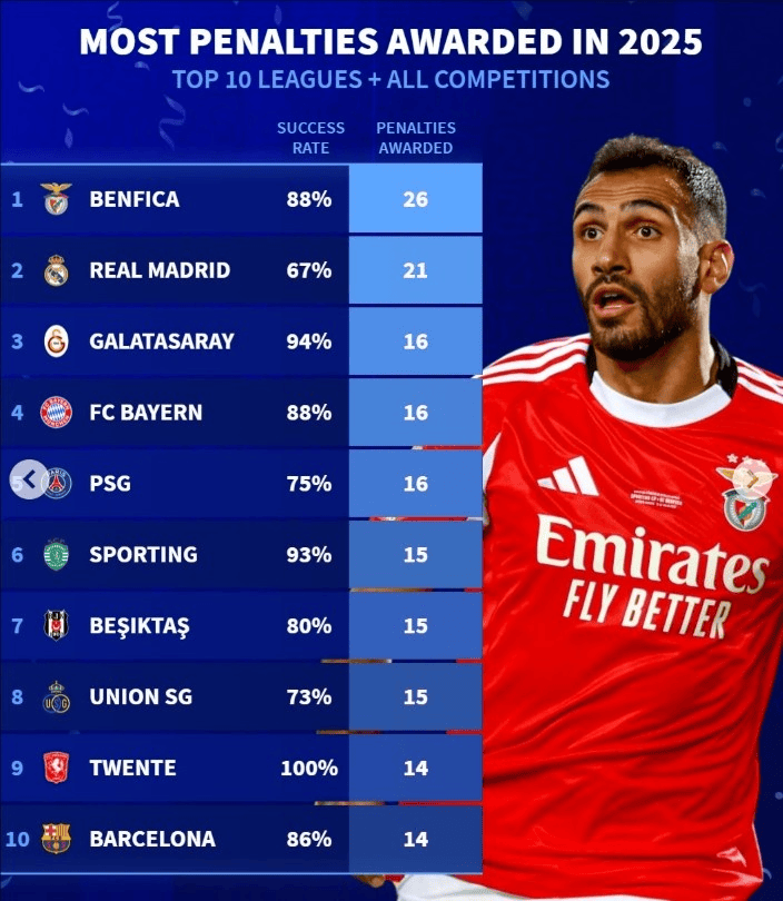 虎扑01月07日讯德国转会市场盘点了在2025年各项赛事获得最多点球的欧洲前十联赛球队,详情如下: