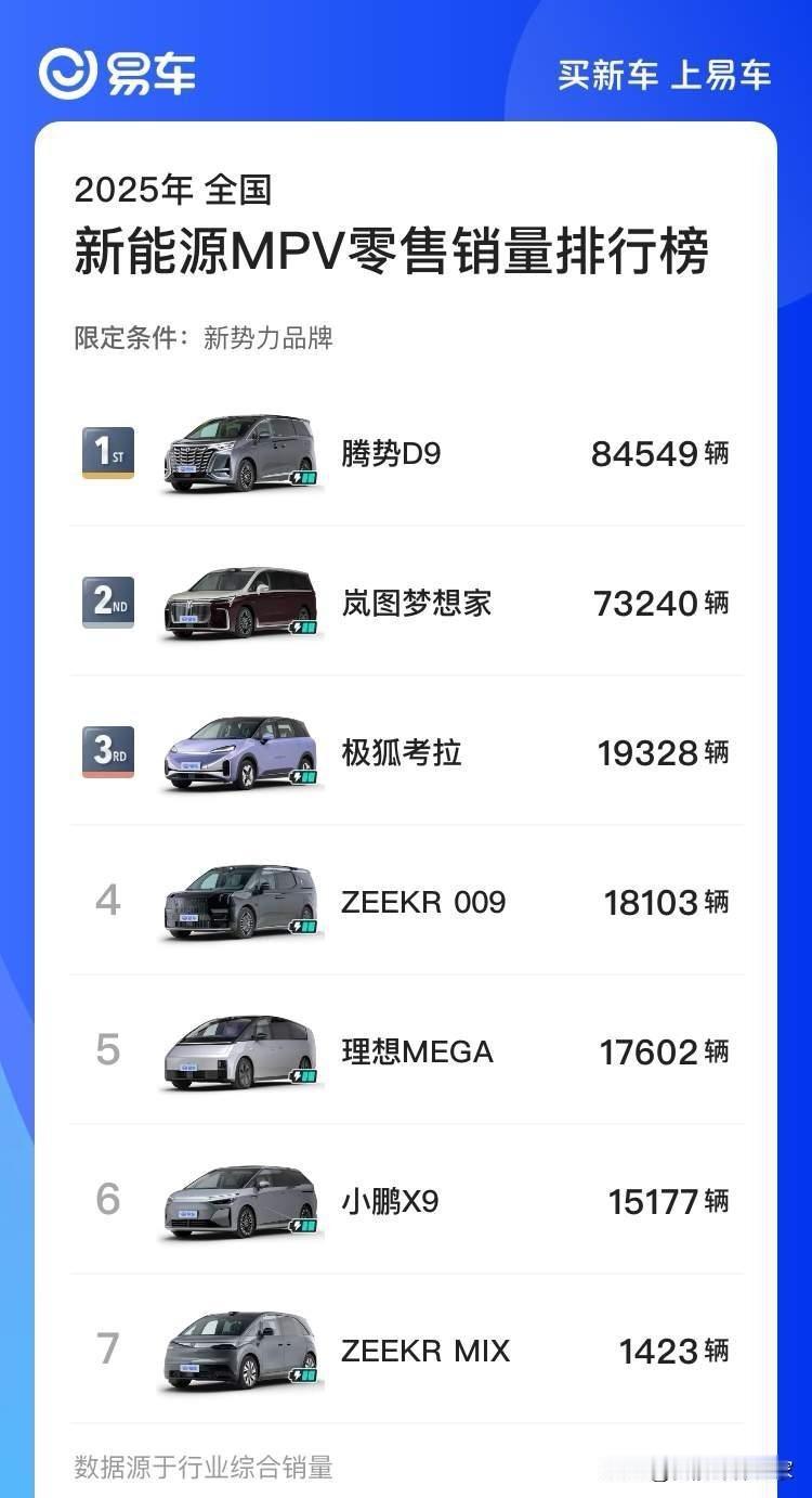 哈哈,这波操作可以说是把"田忌赛马"玩明白了。 在全年销量排行榜上,岚图梦想家输给了腾势D9,屈居第二。 但它巧妙地换了个维度,聚焦"高端MPV"和"下半年"这两个细分领域。 结果一下子就拿到了两个冠军,成了"双冠王"。 这就好比考试总分没考过第一名,但宣布自己是"语文单科状元"和"下半年进步最快学生"。 虽然听着有点"换赛道"的意思,但确实也都是实打实的成绩。 26款D9和D9L要来了