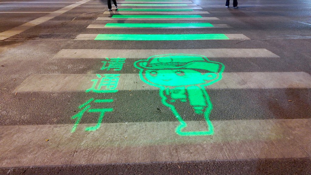 与传统斑马线的“沉默静态”不同,该路口的斑马线多了“动态提醒”功能,格外醒目吸睛。红灯亮起时,路面同步投射出醒目的红色光影,“请您等待”字样搭配着卡通等候形象,清晰又可爱;绿灯放行的瞬间,光影立刻切换成绿色,卡通行走图案指引行人安全过街,直观又生动,彻底告别了传统标线的生硬与模糊。