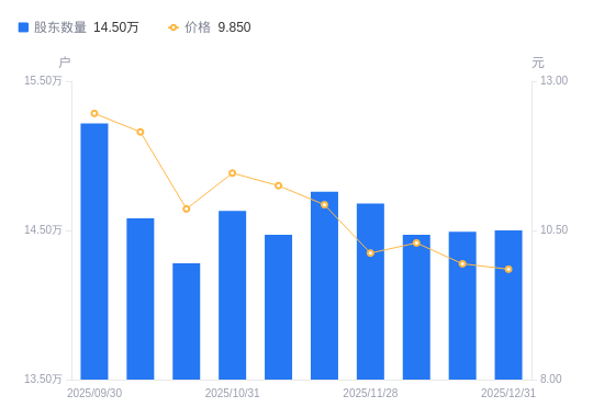 日期A股户数(户)流通A股户均持股数(股)户均持股市值(万元)2025-12-3114500017765.6617.502025-12-1914490017777.9217.672025-12-1014470017802.4918.322025-11-2814680017547.8217.762025-11-2014760017452.7119.082025-11-1014470017802.4920.032025-10-3114630017607.8020.182025-10-2014280018039.3619.592025-10-1014580017668.1821.472025-09-3015216816928.7921.09