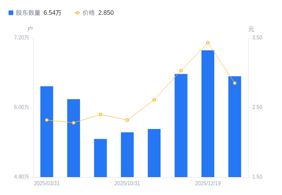 近一年(2024年12月31日至2025年12月31日),世联行A股股东户数从6.88万户,减低至6.54万户,降幅4.98%,区间股价上涨6.34%。