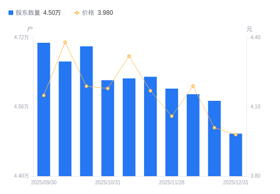 日期A股户数(户)流通A股户均持股数(股)户均持股市值(万元)2025-12-314498357780.4523.002025-12-194574156822.9422.792025-12-104589356634.7423.732025-11-284602456473.5322.932025-11-204629656141.7423.412025-11-104626056185.4324.272025-10-314621856236.4923.512025-10-204700055300.8123.172025-10-104664955716.9024.402025-09-304708155205.6622.91