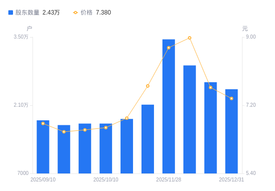 日期A股户数(户)流通A股户均持股数(股)户均持股市值(万元)2025-12-312428712611.739.312025-12-192572411907.219.132025-12-102917510498.769.432025-11-28345378868.787.732025-11-102112214501.5211.182025-10-201820416826.0411.542025-10-101723017777.2011.752025-09-301723117776.1711.642025-09-191693318089.0111.762025-09-101792017092.7011.49