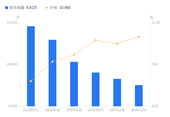 日期A股户数(户)流通A股户均持股数(股)户均持股市值(万元)2025-12-319909632830.1035.002025-12-1010181831952.4233.232025-10-3110451831127.0032.782025-09-3010911529815.6229.732025-06-3011866027417.2626.622025-03-3112447326136.8523.422024-12-3112767225481.9525.072024-09-3013714423722.0123.412024-06-3014396722597.7617.942024-03-3115028621647.6016.30