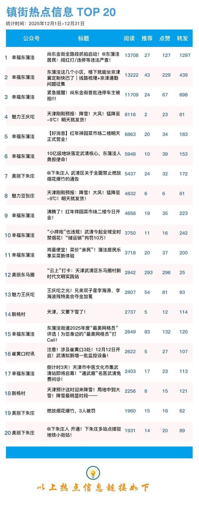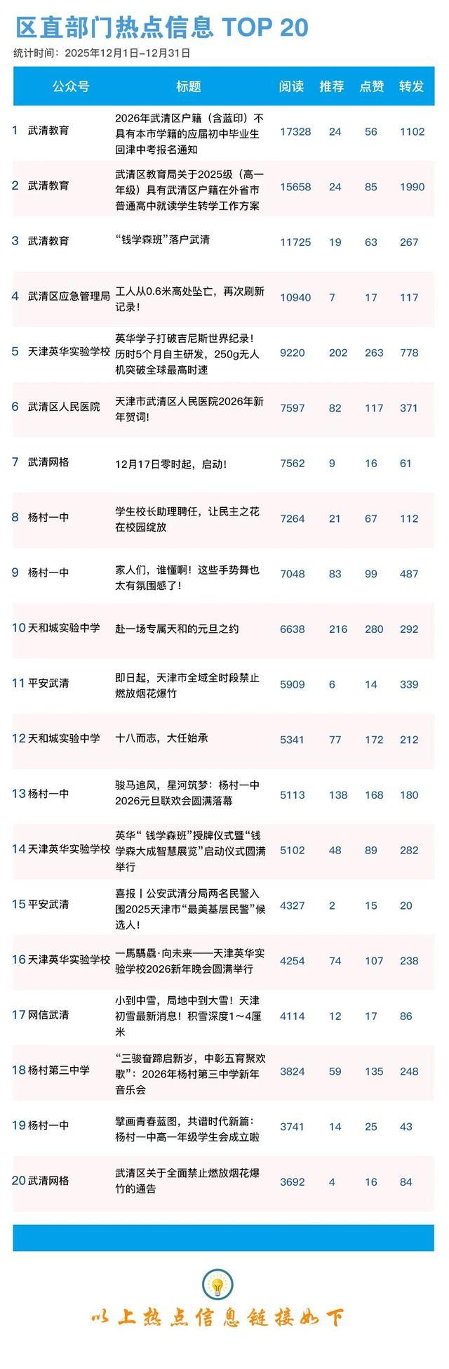 2025年12月份,武清区各级政务新媒体充分发挥主力军作用,聚焦校园风采、安全生产、便民通勤等热点,推出一批接地气、有网气、聚人气的精品力作,为加快建设京津明珠、幸福武清营造浓厚网络舆论氛围。12月份各镇街、区直各部门热点信息有哪些?一起来看↓↓↓