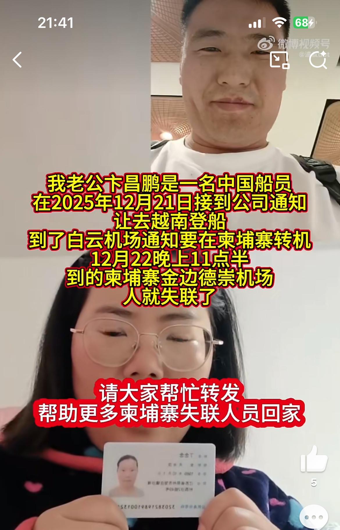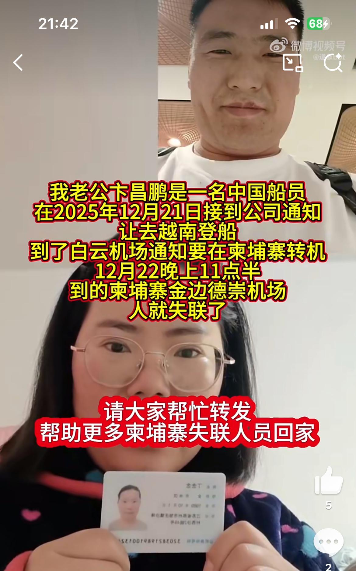 这个女子的老公在柬埔寨转机失联,12月22日距今半个多月,不见消息,女子实名寻找。他的老公叫卞昌鹏,是一名中国船员,被公司通知去越南登船。在广州白云机场登机准备去越南,却从柬埔寨转机,人到柬埔寨金边崇德机场失联。这就有点长扯谈了,广州白云到越南,不管那个方向,都要比去柬埔寨近,不用舍近求远去柬埔寨中转。柬埔寨失踪案
