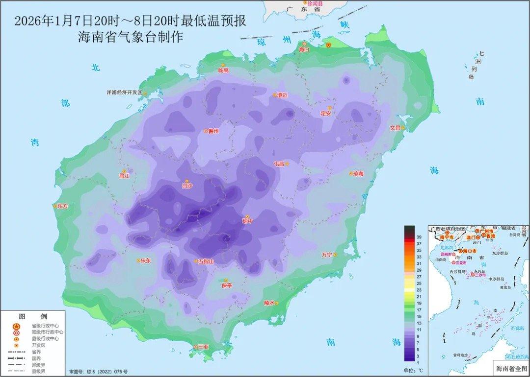 海南省气象局2026年1月7日16时30分继续发布寒冷四级预警信号:受较强冷空气影响,预计7日夜间至9日夜间,澄迈、临高、定安、儋州、白沙、屯昌、琼中和五指山等8个市县的大部分乡镇最低气温将降至10℃及以下,请有关单位和人员做好防范工作。