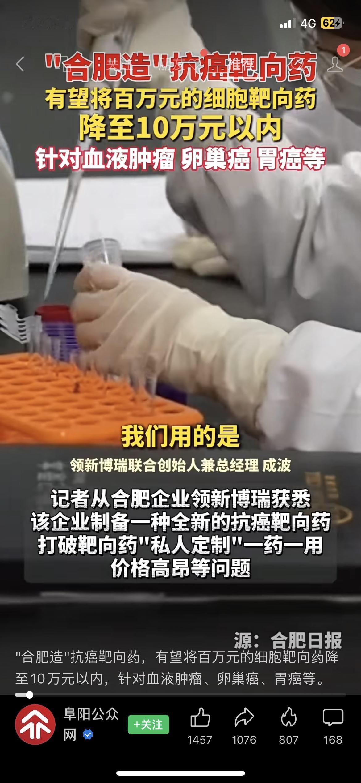 合肥造抗癌靶向药要降价!百万药费将至10万内,造福无数家庭 家人们,看到阜阳公众网的消息,我真的热泪盈眶!合肥的企业领新博瑞研发出了全新的抗癌靶向药,用了诺贝尔奖的“点击化学”技术,打破了靶向药“私人定制”、一药一用、价格高昂的问题,有望把原本百万元的细胞靶向药降到10万元以内! 这款药针对血液肿瘤、卵巢癌、胃癌等多种癌症,预计2026年8月启动IIT临床试验,2026年将申报国家一类新药IND,获批后就能开展正式临床,研发团队还获评了安徽省2025首批高层次科技团队。 想想看,以前很多癌症患者因为天价药费,只能眼睁睁放弃治疗,现在这款药有望大幅降价,多少家庭能看到希望啊!这就是咱们中国的科技实力,为合肥的科研团队点赞! 希望这款药能早日上市,让更多患者受益!你们身边有受癌症困扰的家庭吗?一起为科研人员加油! 合肥造抗癌药 抗癌药降价 医疗突破靶向治疗药