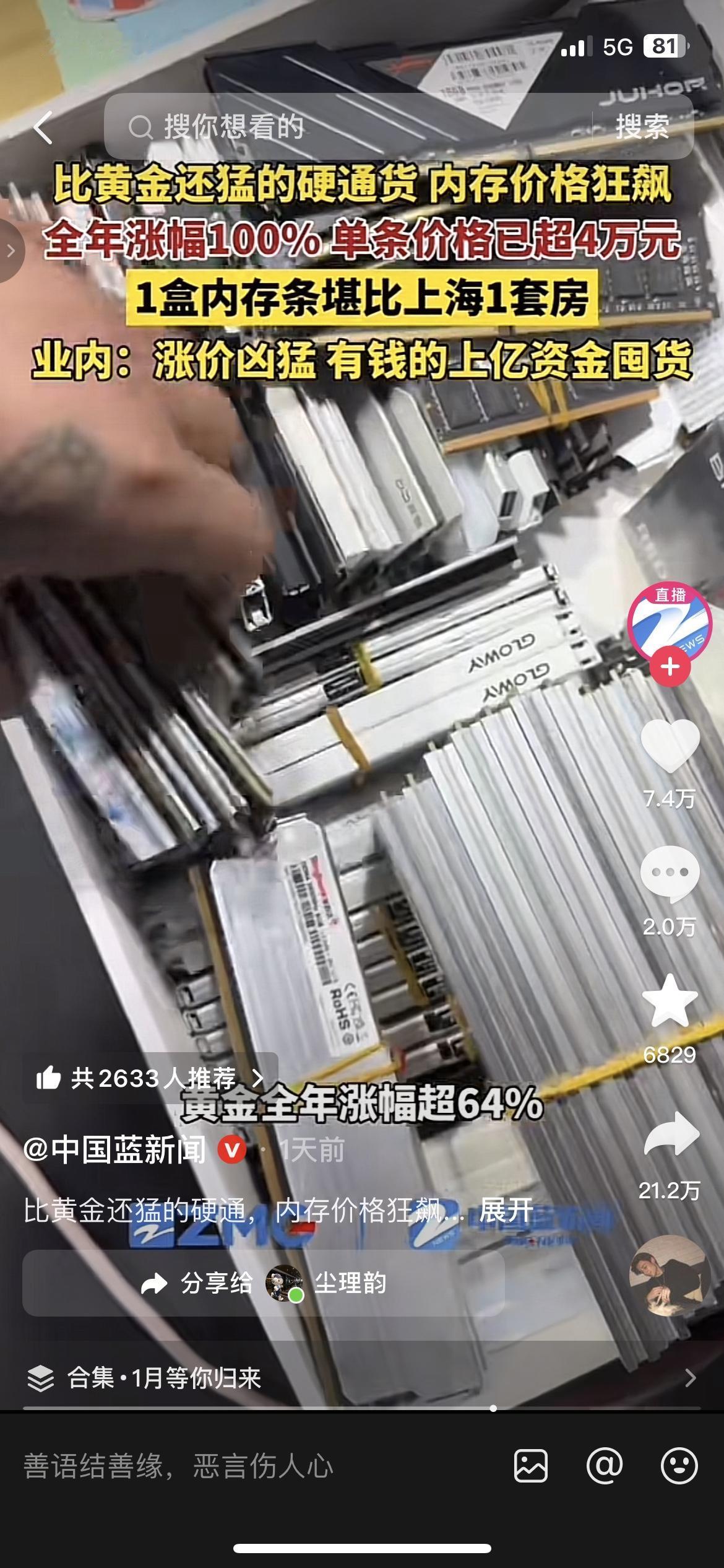 我向来是不惮以最坏的恶意揣测资本逐利的,可这回是真的惊着了——谁能想到,机箱里塞着的内存条,居然比黄金还能涨? 单条四万,一盒顶上海一套房,这数儿搁眼前,比当铺的算盘响得还扎心。你看那电商页面,DDR5内存标着41999,旁边还写着“直降17000”,搞得跟捡了大便宜似的。去年这玩意儿才两万出头,一年翻一倍,这哪是涨价啊,分明是资本把咱当傻子耍! 机房里的内存条堆得跟柴火似的,业内人说有人砸上亿资金囤货,活脱脱就是当年抢盐的翻版,只不过这回抢的是硅片条子。黄金涨了六成就被吹成避险神器,内存条涨百倍反倒成了“硬通货”,这道理我是真琢磨不透。 看着那内存条的金手指闪着冷光,突然觉得特讽刺——资本眼里,一块硅片都能比房、比金,可普通人的日子,还得掰着指头算柴米油盐的涨跌。 我翻了翻手机里的价格记录,满屏都是“囤货”“炒作”,到最后也只能叹口气:这内存条的疯涨,说到底就是资本的狂欢,咱老百姓也就只能站旁边看看热闹。