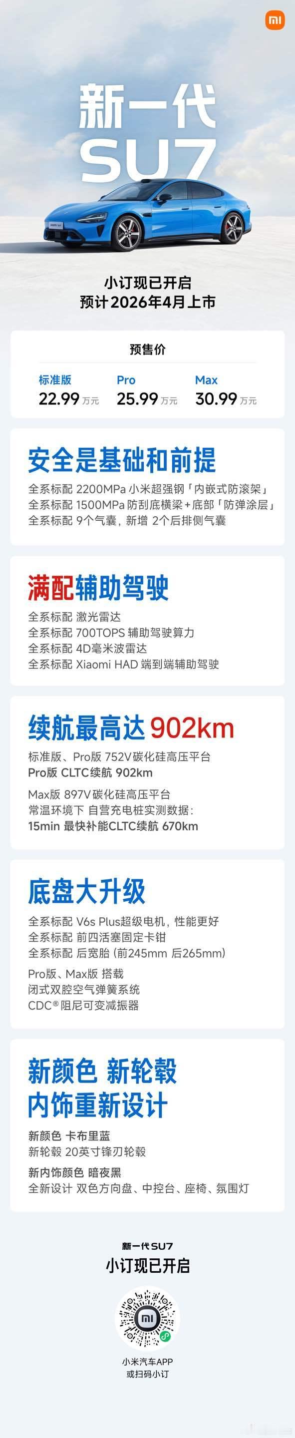 小米不按套路出牌,按理说卖这么好没理由升级,想当年很多车十年不改款照样卖…时代变了,不卷不行啊,居安思危嘛,所以新款小米su7来了,进一步提升,外观看得见的变化不算大(前杠优点su7u的感觉),但实际上内在变化挺大…2200兆帕的内嵌式防滚架塞进去了,全系标配v6s plus电机,性能更好,能耗更优续航更长,标称干到902了,标配激光雷达,新增蓝色倒是看各人喜好,具体看图吧新款预售价贵了一万,确实也升级了,如今这个市场还敢涨价的实属不多见,我感觉更多是照顾老车主的情绪吧,价格不变的话怕老车主维权,毕竟车主是车企根基,涨太多又会被喷膨胀了,我觉得贵个几千意思意思得了…不光是小米,我觉得所有的车主都需要明白一点,车企不是搞慈善的,只有他良性发展进步,车主才能获得更好的服务和保障,说直白点只有活下去的车企才是你的希望,不然想想xx和xx还有xx…买贵点便宜点算个xx,最后一段跑题了…