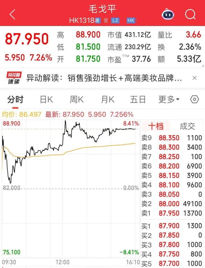 1月7日,毛戈平股价高开低走,随后强势反弹,最高涨幅8.41%,截至收盘,股价报87.95港元,涨幅7.26%。以当天公司收盘价计算,上述股东拟套现15.1亿港元(折合人民币13.6亿元)。