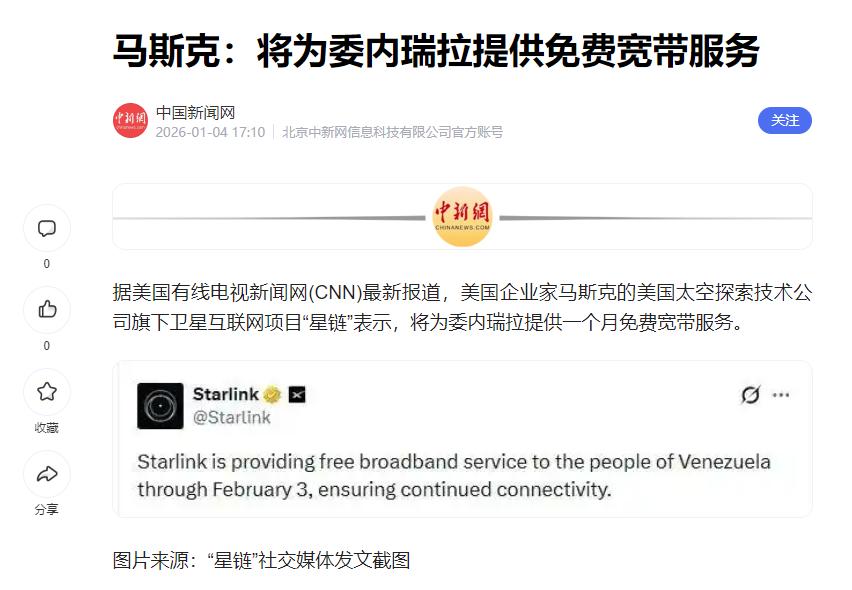 据美国有线电视新闻网(CNN)最新报道,美国企业家马斯克旗下的,卫星互联网项目“星链”表示,将为委内瑞拉提供,一个月免费宽带服务。但这份大礼,怎么看都像一个陷阱。 委内瑞拉这地方的处境,早就被美国折腾得够呛。从查韦斯时代开始,美国就因为石油利益和意识形态差异,跟委内瑞拉不对付,常年搞制裁、搞封锁。这些年下来,委内瑞拉老百姓连基本的生活用品都缺,网络通信更是差得离谱。   就在这种节骨眼上,马斯克的星链带着免费宽带来了,你说委内瑞拉老百姓能不心动吗? 可当地人不知道的是,星链这东西,看着是民用宽带,本质上却是个军民两用的狠角色。 之前俄乌冲突的时候,星链的表现大家有目共睹,刚开始也是以“援助民用”的名义进入乌克兰,结果转头就给乌军提供战场通信服务,精准定位俄军目标,直接成了乌军的“战场天眼”。 有数据显示,冲突期间星链给乌克兰提供了,超过10万个终端,乌军的前线部队全靠它来协调行动,甚至连无人机攻击都得依赖星链的信号。 后来马斯克自己都承认,星链在战场上的作用远超预期,还一度因为担心卷入太深,想限制星链在乌克兰战场的使用范围。   这还不是最关键的,星链的控制权完全攥在马斯克和美国手里。卫星怎么转、信号覆盖哪里、给谁用不给谁用,全是他们一句话的事。 当年马斯克一句话,就能让星链在乌克兰某些战场区域“断网”,直接影响战局走向。 现在把这东西免费送到委内瑞拉,相当于把国家的通信命脉之一,拱手交给了一个外国商人,还是个跟美国政府关系不清不楚的商人。   委内瑞拉国内的局势本就复杂,反对派一直想借着外部势力翻盘。星链这时候进来,很难保证不会成为反对派的“专属通信通道”。 要知道,星链的信号穿透力强,还能避开政府的网络监管,反对派完全可以利用星链组织串联、散布谣言,甚至跟外部势力勾结。 到时候,委内瑞拉政府连对方的通信都监控不了,局势只会更加混乱。   这种用“免费援助”渗透他国的套路,美国早就玩得炉火纯青了。当年冷战时期,美国就经常通过提供粮食、药品、技术援助的名义,在其他国家培养代理人,干涉他国内政,甚至推翻合法政府。 最典型的就是智利,美国通过资助反对派、散布负面舆论,最终搞垮了阿连德政府,扶持皮诺切特上台,导致智利陷入了长期的独裁统治和动荡。   再看看马斯克本人,他跟美国政府的联系可不是一般的深。星链项目从一开始就拿了美国政府的不少补贴和订单,美国军方更是星链的大客户,经常采购星链终端用于军事行动。 之前美国想在某些敏感地区部署星链,马斯克二话不说就配合,压根就没考虑过当地国家的主权。 现在他跑到委内瑞拉送免费宽带,很难说没有美国政府的默许甚至暗中支持。毕竟,美国一直想搞垮委内瑞拉现政府,星链说不定就是他们安插进去的“楔子”。   有人可能会说,不就是个上网工具吗?至于这么小题大做吗?可别忘了,网络空间早就成了新的战场。 并且,星链一旦在委内瑞拉站稳脚跟,就能通过网络向当地民众灌输美国的价值观,抹黑委内瑞拉政府,制造社会对立。 这种文化和意识形态的渗透,比直接的军事打击更隐蔽,也更致命。   而且星链的运营模式本身就藏着猫腻。这次说是免费用到2月3号,可免费期一过呢?要么收钱,要么就断网。 更有意思的是,马斯克选择在这个时间点出手,背后肯定有自己的算计。 最近星链虽然名气大,但亏损也很严重,委内瑞拉虽然穷,但好歹是个有几千万人口的国家,是个潜在的大市场。 这次免费送宽带,说白了就是“亏本赚吆喝”,先把用户圈进来,培养使用习惯,等后续再通过收费、广告等方式赚钱。 而且拿下委内瑞拉市场,还能给星链增加一个重要的战略支点,以后在南美地区拓展业务也会更顺利。   还有一点不能忽视,星链的卫星在天上飞,会占用大量的轨道资源和频谱资源。 这些都是全球有限的公共资源,马斯克通过免费送宽带的方式,抢先在委内瑞拉占据市场,相当于变相抢占了这些宝贵的资源,挤压其他国家的发展空间。 这背后的长远利益,可比短期的宽带费用高多了。