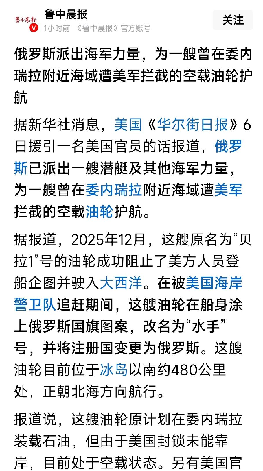 重磅消息!1月7日,美国扣押了由俄罗斯潜艇护航的一艘油轮,美方人员已登上该油轮。