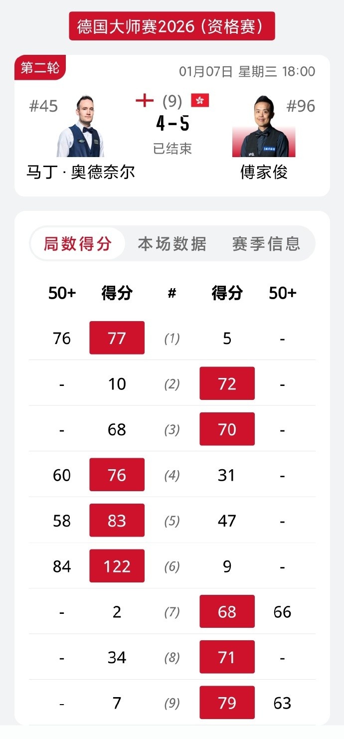 直播吧1月7日讯斯诺克德国大师赛资格赛,傅家俊5-4逆转奥唐奈尔,晋级第3轮。